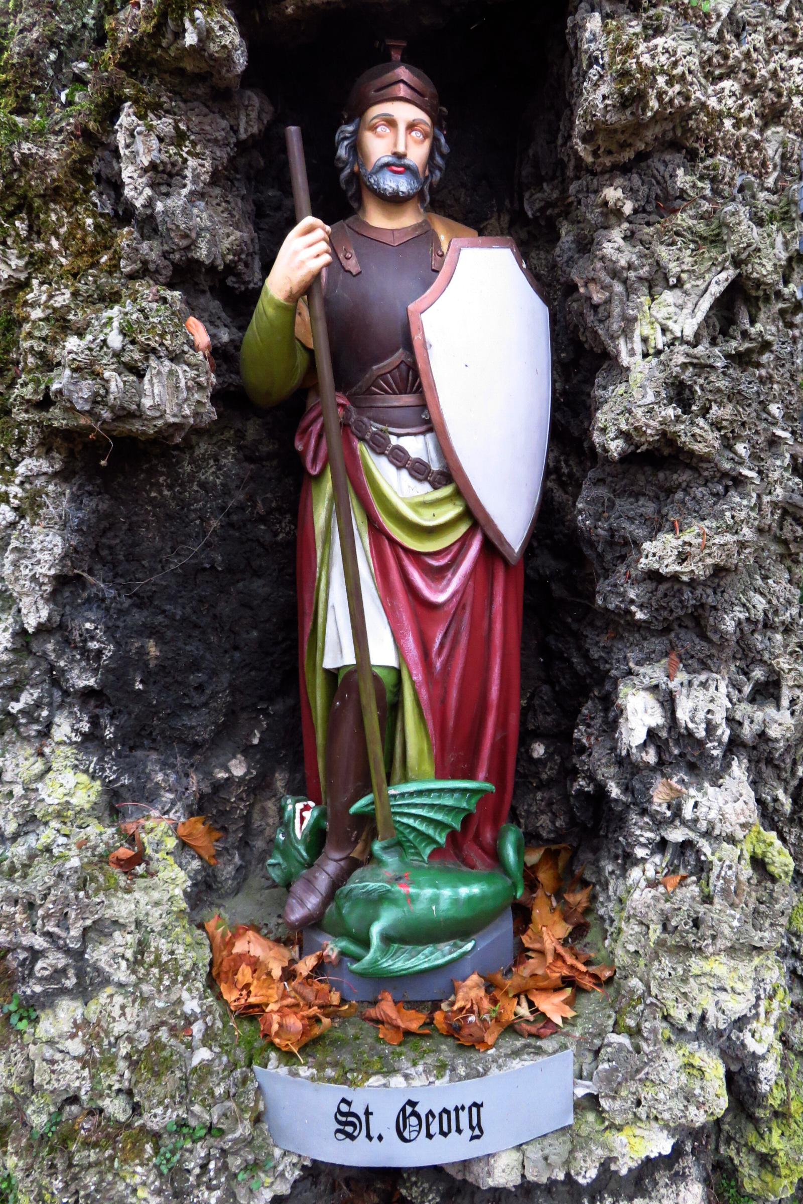 Standort: Die Figur des Heiligen Georg befindet sich in der Grotte der Vierzehn Nothelfer in Heiligenpesch 81 b, im Stadtteil Mönchengladbach - Hehn. Die Grottenanlage steht in der Denkmalliste der Stadt Mönchengladbach mit der Nr. H 036 unter Denkmalschutz. Kurzgeschichte: Georg war ein Römischer Offizier, der als Märtyrier im frühen 4. Jahrhundert enthauptet wurde. Ein Überlieferungszweig versteht ihn als Drachenkämpfer. Er ist Helfer gegen Beschimpfungen, Fieber, Kriegsgefahr, Lepra und Pest. Er ist Patron der Böttcher, Reiter, Sattler, Schützen, Wanderer, Pferde u.a.m. Dargestelt wird er als Ritter mit Schild und Schwert und einem Drachen. Fest am 23. April Quellenangabe: Die Vierzehn Nothelfer (150 Jahre Pfarre St. Mariae Heimsuchung in MG-Hehn)