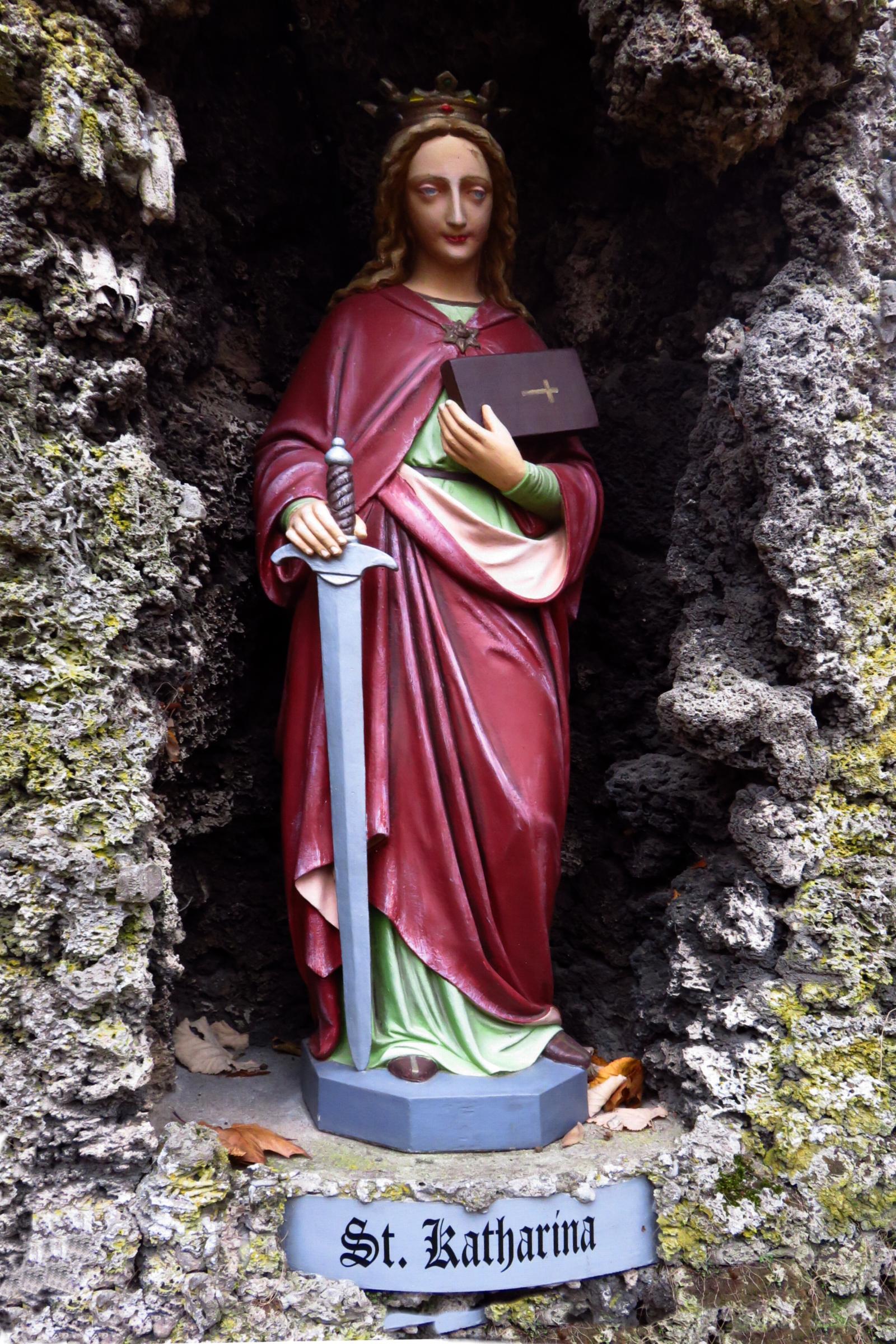 Standort: Die Figur der Heiligen Katharina von Alexandrien befindet sich in der Grotte der Vierzehn Nothelfer in Heiligenpesch 81 b, im Stadtteil Mönchengladbach - Hehn. Die Grottenanlage steht in der Denkmalliste der Stadt Mönchengladbach mit der Nr. H 036 unter Denkmalschutz. Kurzgeschichte: Kernstück der griechichen Urfassung der Katharina-Legende ist das Martyrium unter Kaiser Maxemilian im Anschluss an einen theologischen Disput. Da das Rad zerbrach, auf dem sie gerädert werden sollte, wurde sie mit dem Schwert enthauptet. Sie ist Helferin bei Migräne und Zungenkrankheiten. Sie ist Patronin der Mädchen, Buchdrucker, Gerber, Müller, Seiler Tuchhändler u.v.m. Dargestellt ist sie mit Schwert und Buch. Fest am 25. November. Quellenangabe: Die Vierzehn Nothelfer (150 Jahre Pfarre St. Mariae Heimsuchung in MG-Hehn)