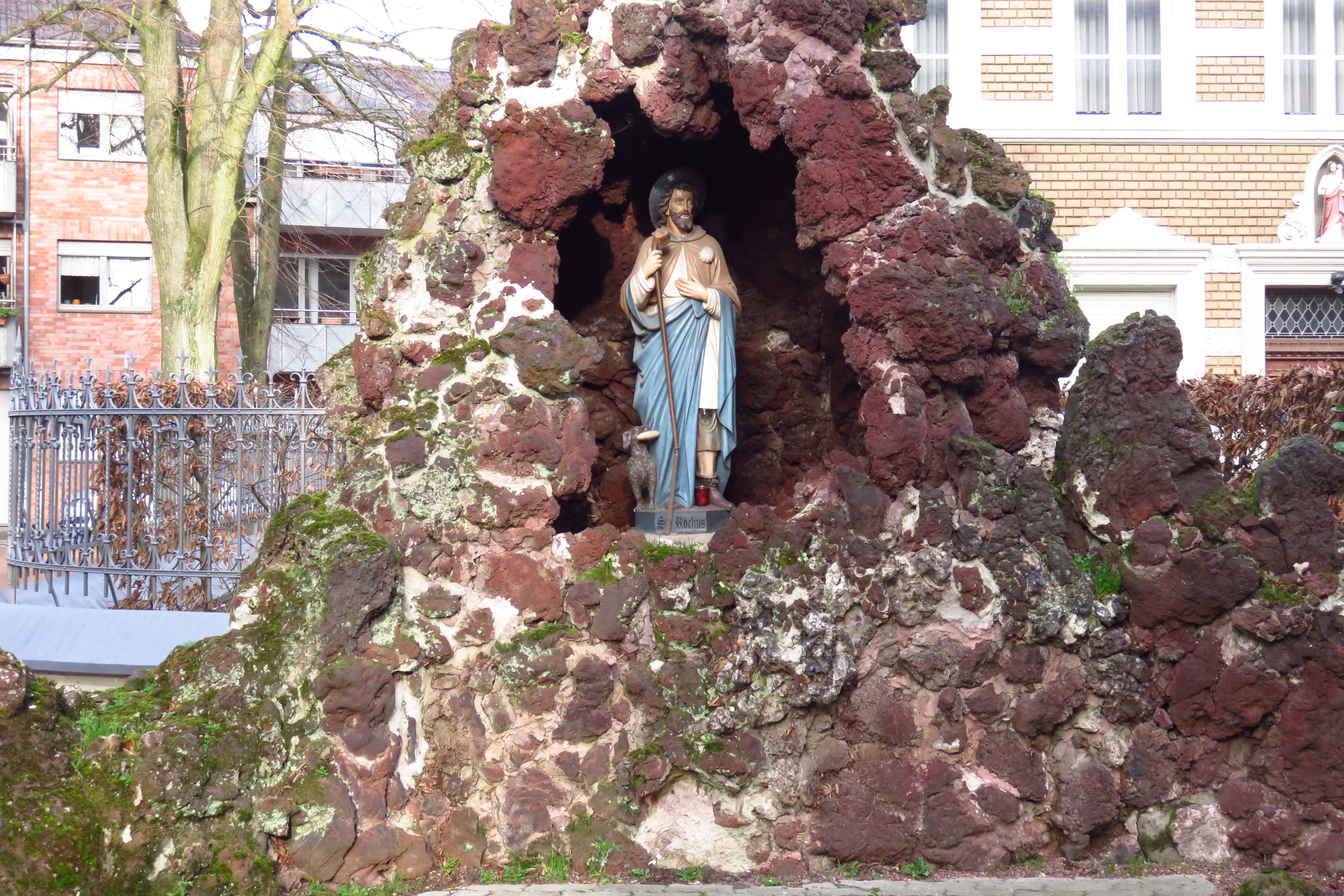 Standort: Die Figur des Heiligen Rochus befindet sich in der Grotte, in der Nähe der Gnadenkapelle in Heiligenpesch 81, im Stadtteil Mönchengladbach - Hehn. Die Grottenanlage steht in der Denkmalliste der Stadt Mönchengladbach mit der Nr. H 036 unter Denkmalschutz. Kurzgeschichte: Rochus ist schon früh in Hehn verehrt worden. Der Legende nach war er 1317 zur heiligen Stadt Rom gepilgert, hatte unterwegs Pestkranke gepflegt, sich dabei angesteckt und in einer Hütte im Wald Zuflucht gefunden, als er sich vor den Menschen verbergen mußte. Dort wurde er von einem Hund mit Brot versorgt, um nicht zu verhungern. Rochus war ein Bauernheiliger und Patron der Tiere. Dargestellt wird er mit einem Hirtenstab und mit einem Hund. Quellenangabe: Die Vierzehn Nothelfer (150 Jahre Pfarre St. Mariae Heimsuchung in MG-Hehn)
