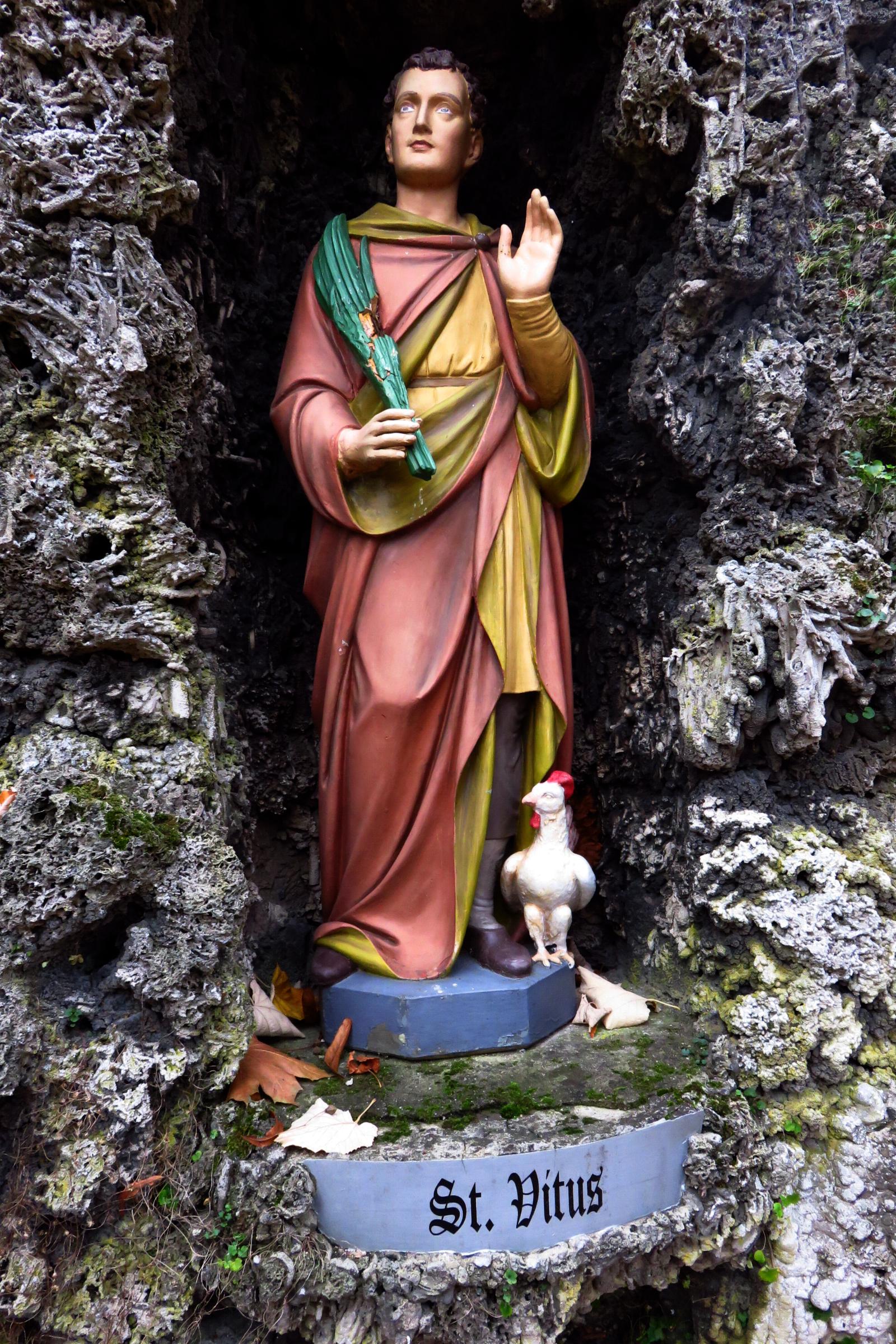 Standort: Die Figur des Heiligen Vitus befindet sich in der Grotte der Vierzehn Nothelfer in Heiligenpesch 81 b, im Stadtteil Mönchengladbach - Hehn. Die Grottenanlage steht in der Denkmalliste der Stadt Mönchengladbach mit der Nr. H 036 unter Denkmalschutz. Kurzgeschichte: Als christlicher Märtyrer gestorben um 305. 1533 wurde sein Haupt in den Veitsdom (Prag) überführt. Er ist Helfer gegen Besessenheit, Bettnässen, Blindheit, Feuer, Tollwut, Unwetter und Schlangenbiss. Er ist der Schutzpatron der Mönchengladbacher. Dargestellt wird er als Jüngling mit Palme und Hahn. Fest am 15. Juni. Quellenangabe: Die Vierzehn Nothelfer (150 Jahre Pfarre St. Mariae Heimsuchung in MG-Hehn)