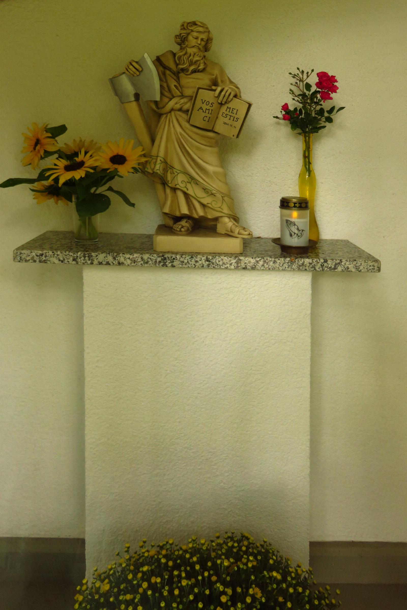 Standort und Geschichte: Der Matthiasbildstock hat seinen Standort zwischen dem Altenheim Holt und der Kirche St. Michael, im Stadtteil Mönchengladbach - Holt. Es handelt sich um einen kleinen verputzten Backsteinbau mit einen nach hinten schräg abfallenden Metalldach. Hinter einer verglasten Gittertüre steht auf einer Altarplatte eine Figur des Hl. Matthias sowie Kerzen- und Blumenschmuck. Info: * Der Heilige Matthias (Apostel und Märtyrer) bei Wikipedia