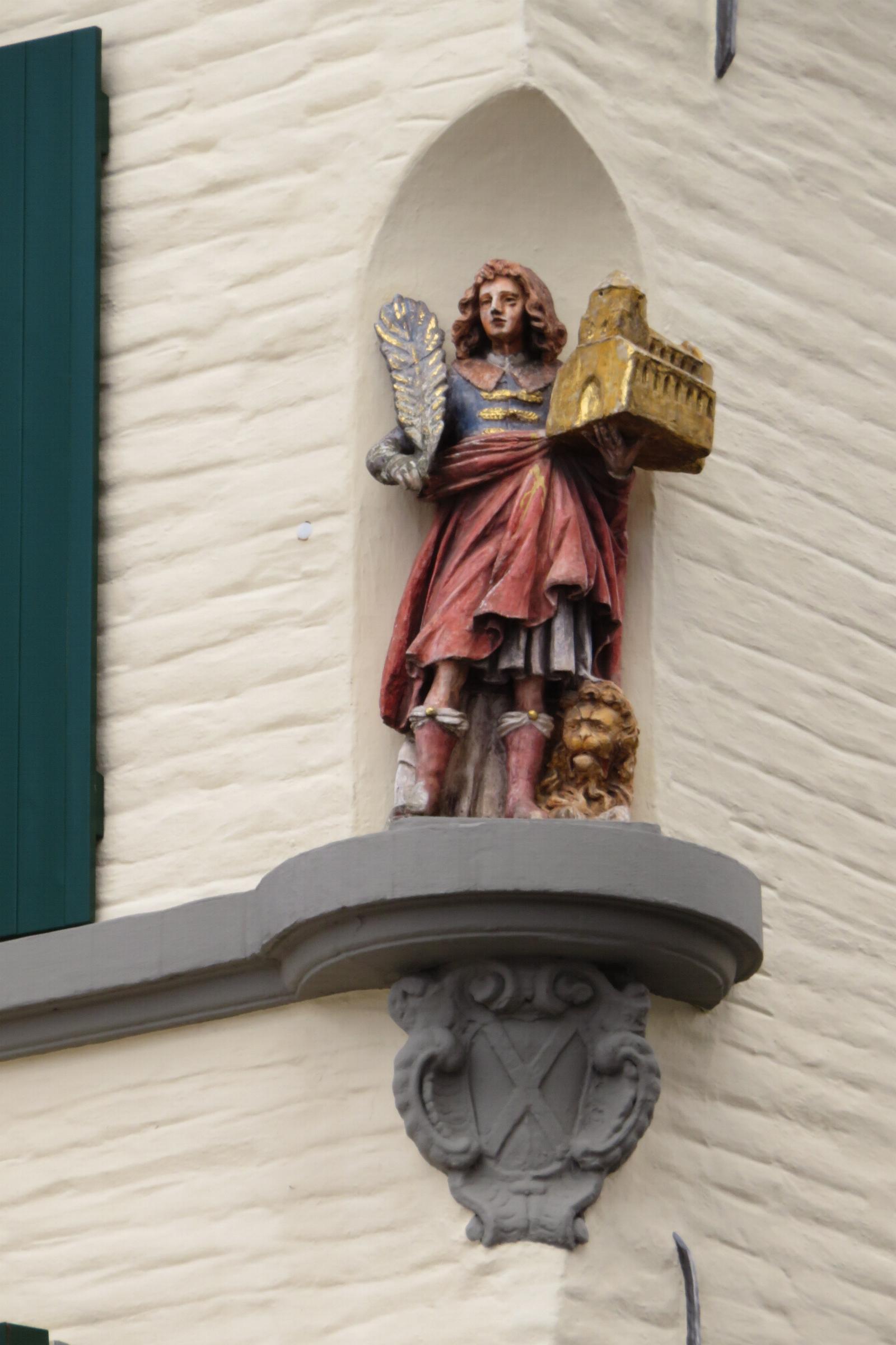 Standort: Die Figur des Heiligen Vith befindet sich in der Wandnische des Hauses St. Vith am Alter Markt 6, in Mönchengladbach - Mitte Kurzgeschichte: Als christlicher Märtyrer gestorben um 305. 1533 wurde sein Haupt in den Veitsdom (Prag) überführt. Er ist Helfer gegen Besessenheit, Bettnässen, Blindheit, Feuer, Tollwut, Unwetter und Schlangenbiss. Er ist auch der Schutzpatron der Mönchengladbacher. |