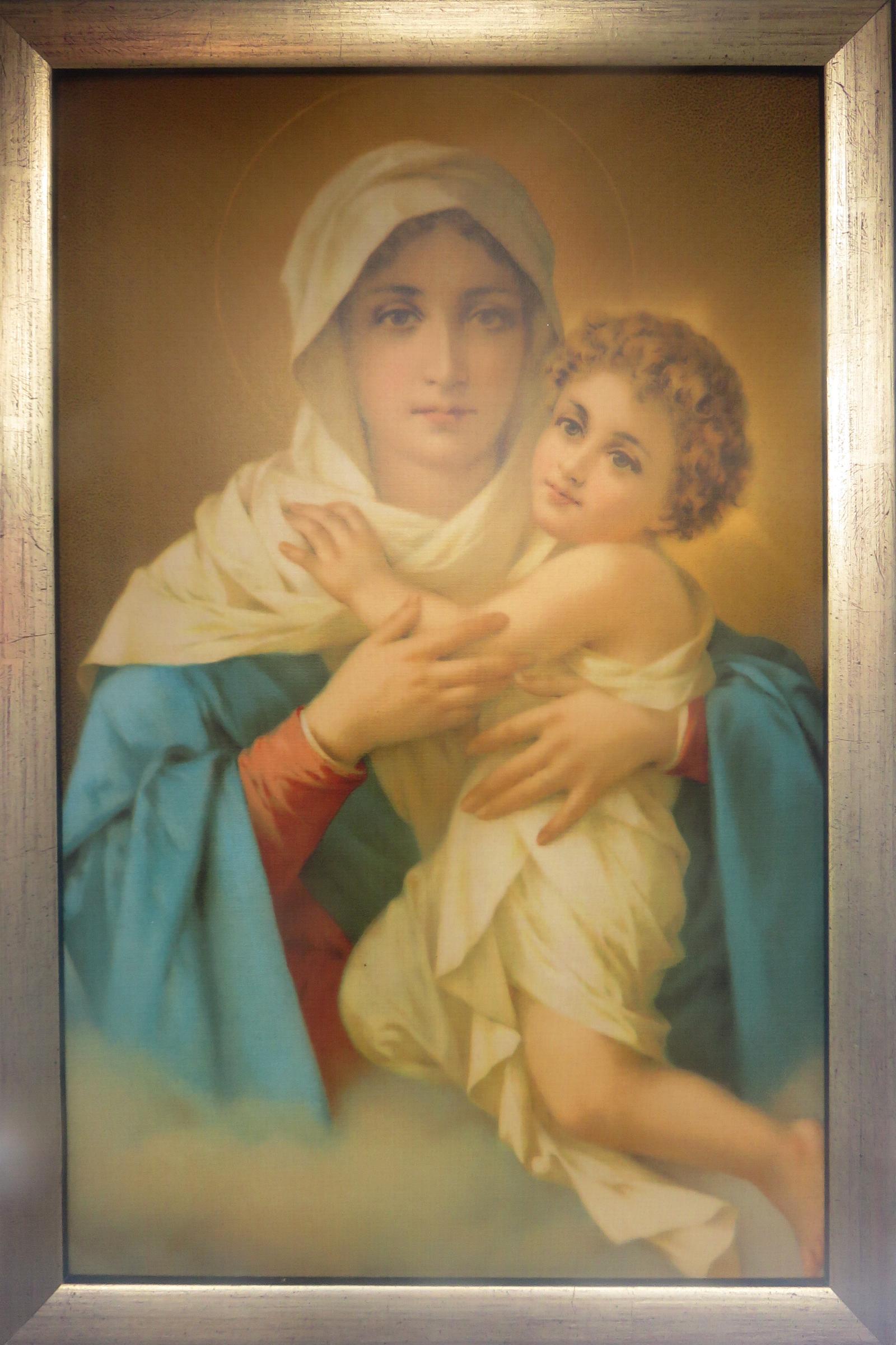 Standort: Der Marienbildstock hat seinen Standort an der Schloß-Dyck-Straße im Stadtteil Mönchengladbach - Schelsen. Der Bildstock ist aus Ziegelsteinen gebaut und trägt ein kleines Satteldach. Hinter einem spitzbogigen Türchen hängt in der Nische ein Marienbild mit Kind.