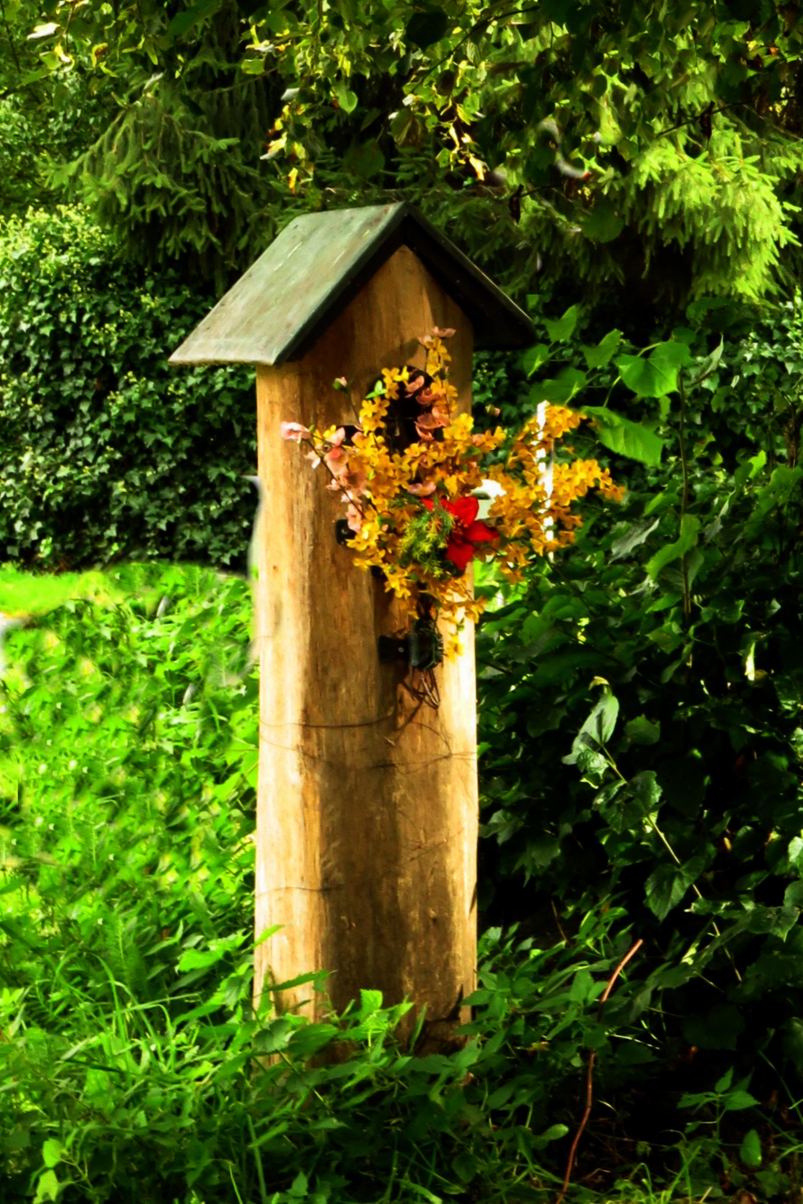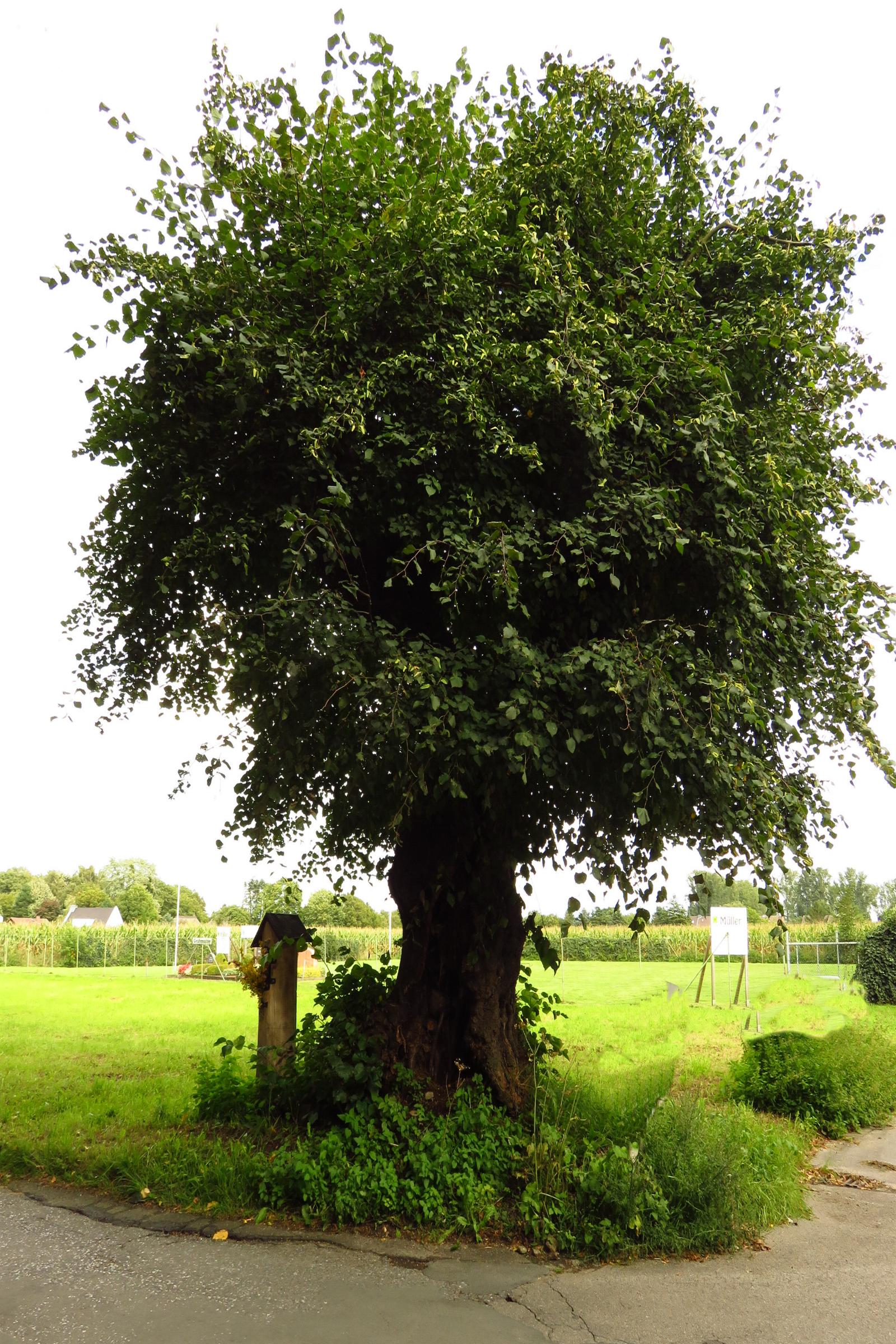 geschnitztes Bildstöckchen mit einem Marienbildnis auf. Die alte Linde,