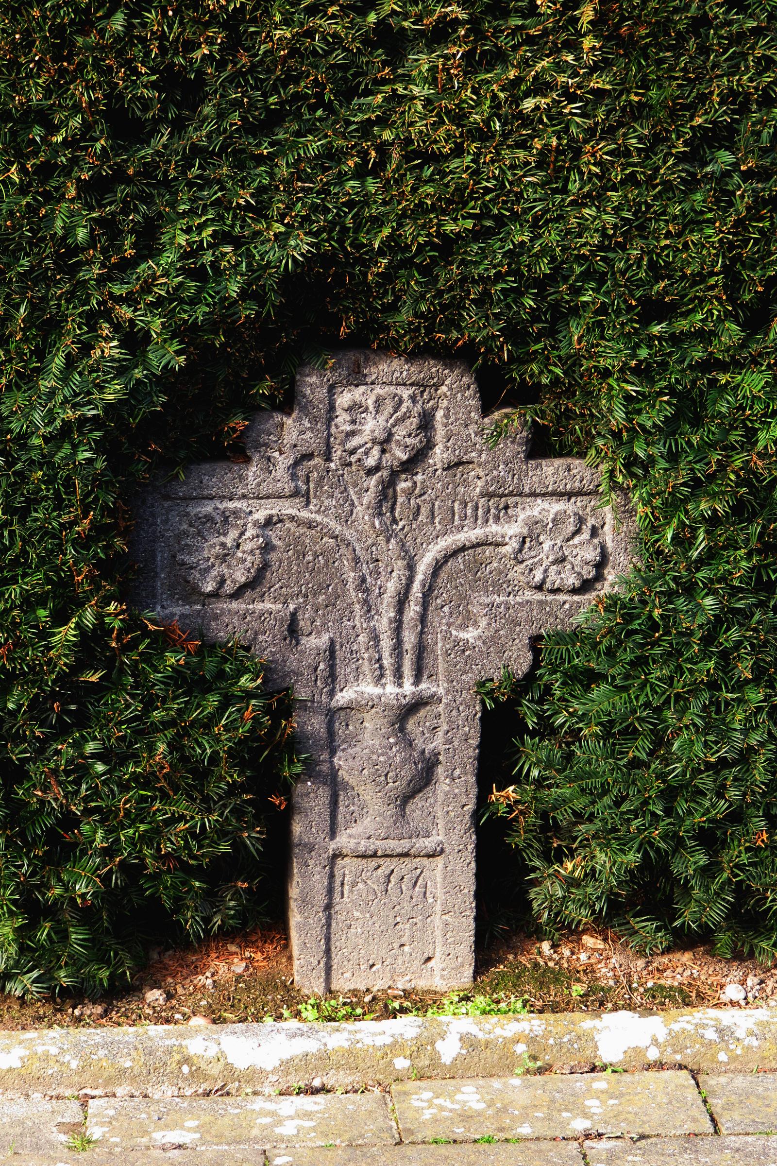 Basaltlava gehauen. Der schlanke Kreuzstamm zeugt eine feine Überarbeitung.