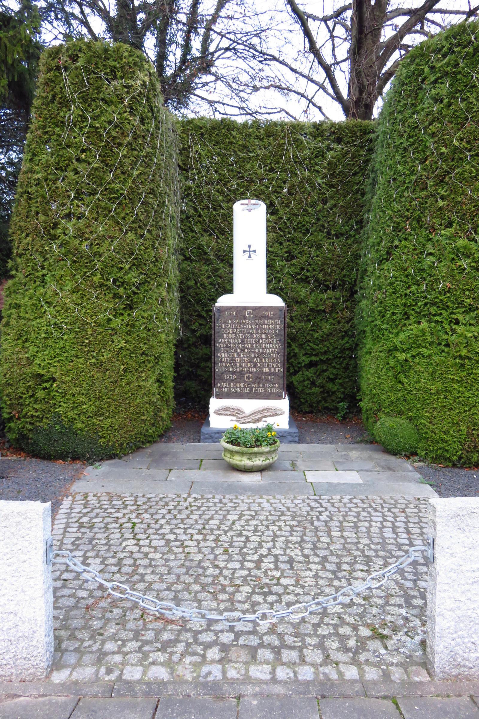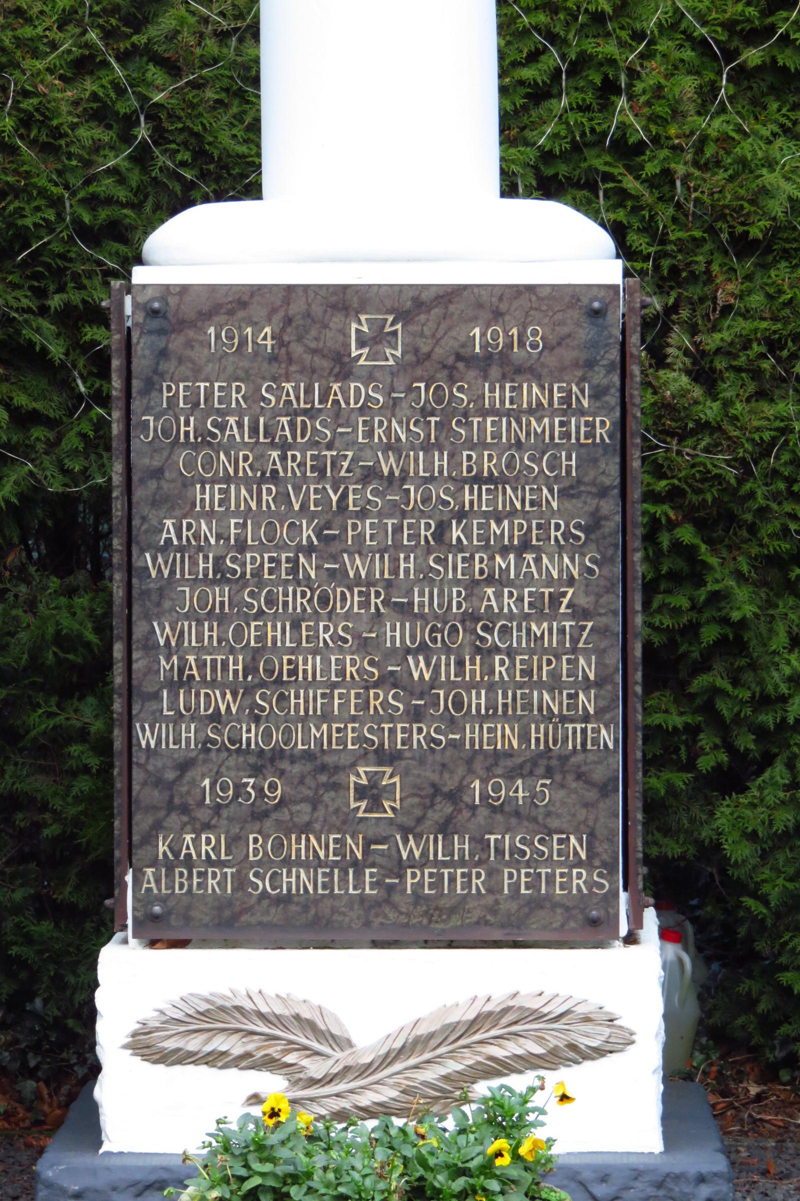 Standort und Geschichte: Das Ehrenmal befindet sich gegenüber der Kapelle in Genhülsen 114, im Stadtteil Mönchengladbach - Genhülsen. Auf dem Mittelteil des Ehrenmals befinden sich die Namen der verstorbenen Soldaten der Weltkriege 1914 - 1918 und 1939 - 1945. Die Pflege des Ehrenmals obliegt der Dorfgemeinschaft Genhülsen. Information: * Das Denkmal und die Namen der Gefallenen in Genhülsen