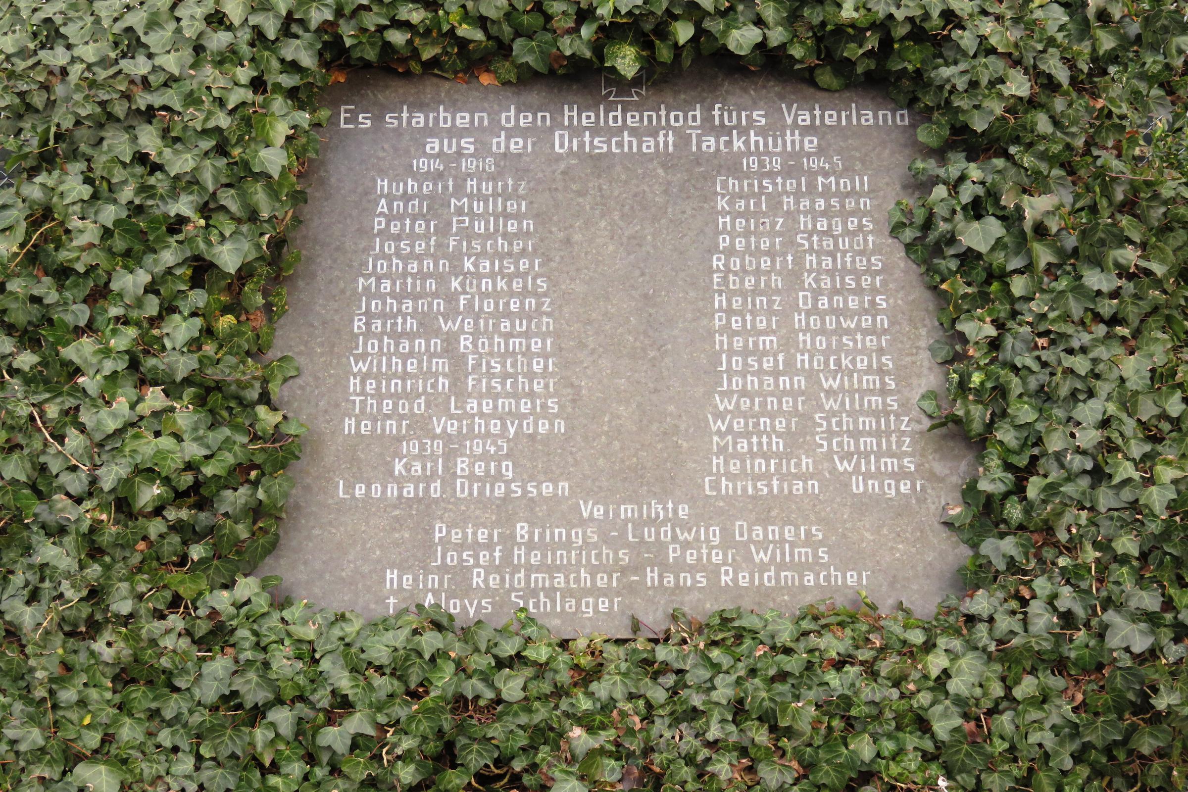 Standort: Die Kriegergedenkstätte hat ihren Standort in der Tackhütte 38, im Stadtteil Mönchengladbach - Giesenkirchen. Sie steht in der Denkmalliste der Stadt Mönchengladbach mit der Nr. T 018 unter Denkmalschutz. Denkmalbeschreibung: An der Straße Tackhütte zwischen den Häusern Nr. 38 und 40, im Ortsteil Giesenkirchen steht die Kriegergedenkstätte. Ein hohes, neogotisches, weiß gestrichenes Sandsteinkreuz mit rechteckigem Stufenunterbau aus Basaltlava, wuchtiges Mittelteil mit Nische unter Korbbogenabschluss. Das schlichte, satteldachförmige Haubendach leitet zur profilierten Basis des Kreuzes über. Das hoch aufragende Kreuz zeigt einen Gusseisencorpus. Im Sockel steht die Inschrift: "O