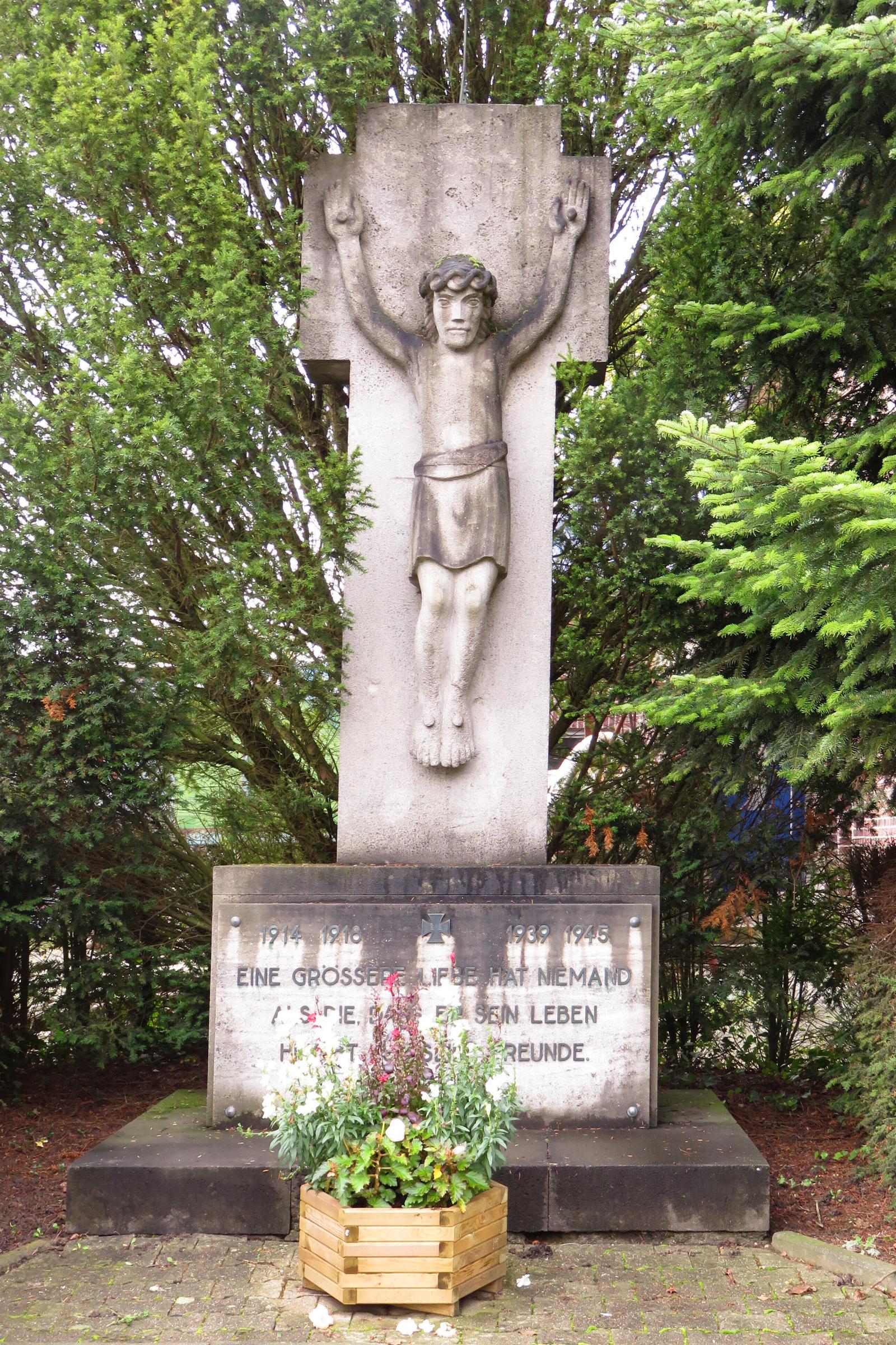 Standort: Die Kriegergedächtnisstätte befindet sich an der Voosener Straße im Stadtteil Mönchengladbach - Günhoven. Geschichte: Auf der Südseite der Voosener Straße in Höhe der Einmündung der Günhovener Straße steht in einer Anlage ein aufragendes Kreuz als Teil einer Kriegergedächtnisstätte. Über mehrere Jahre sammelten die Bewohner von Günhoven für eine Gedächtnisstätte für die Gefallenen des Ersten Weltkrieges. Als 1934 die benötigten Mittel zur Verfügung standen, hatte sich die politische Landschaft drastisch verändert. Die kreuzfeindliche Einstellung der neuen Machthaber konnte aber nicht verhindern, dass die Günhovener an ihrer Absicht festhielten, ein größes Steinkreuz als Ehrenmal aufzurichten. Das aus fränkischem Muschelkalk von einheimischen Künstler Lorenz Körfer geschaffene Kreuz hat für die Günhovener eine doppelte Bedeutung. Es ist als Dorfkreuz ein religiöses Wahrzeichen und zugleich ein würdiges Kriegerdenkmal. Lorenz Körfer war zeitweise Schüler des aus Rheindahlen stammenden Professor Hein Minkenberg. Er schuf ein mächtiges Kreuz mit einer plastisch hervortretenden Christusfigur über einem rechteckigen Tisch. An der Einweihung des Denkmals am 26. Oktober 1934 nahmen die Spitzen der Verwaltung und der Partei teil, die ihre Sichtweise über die Bedeutung eines Kriegerehrenmals herausstellten. Dem Festakt war ein feierlicher Gottesdienst in der Pfarrkirche vorausgegangen und auch die kirchliche Einsegnung war ein Teil des Festaktes. Heute ist es ein Ehrenmal für die Gefallenen beider Kriege. Auf einer Platte steht in Metallbuchstaben mit der Darstellung des Eisernen Kreuzes in der Mitte: "1914 - 1918 1939 - 1945. Eine größere Liebe hat niemand als die, dass er sein Leben hingibt für seine Freunde." Text aus Sakrale Kleindenkmäler - Wegekreuze in Mönchengladbach. Nr. 4 von Heinz Habrich - Klaus Hoffmann