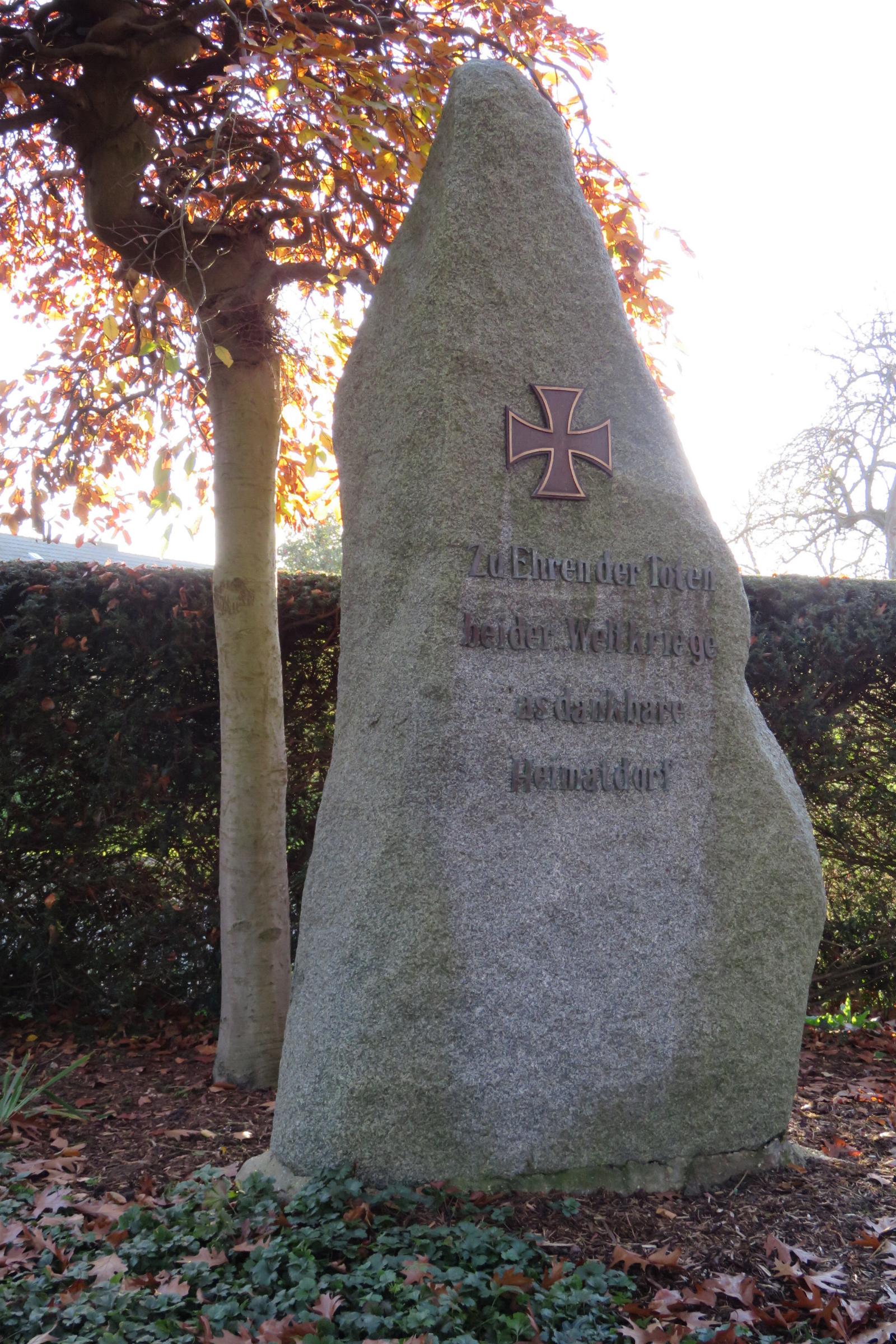 Standort und Geschichte: Der Gedenkstein befindet sich auf dem Emil-Esser-Platz im Stadtteil Mönchengladbach - Herrath. Auf dem Denkmal steht der Schriftzug: "Zu Ehren der Toten beider Weltkriege das dankbare Heimatdorf." Am Volkstrauertag trifft man sich auf dem Emil-Esser-Platz um eine Gedenkfeier mit Kranzniederlegung am Gedenkstein durchzuführen. Die Pflege und Instandhaltung obliegt der Dorfgemeinschaft Herrath. Information: * Das Denkmal in Herrath beim Onlineprojekt Gefallenendenkmäler