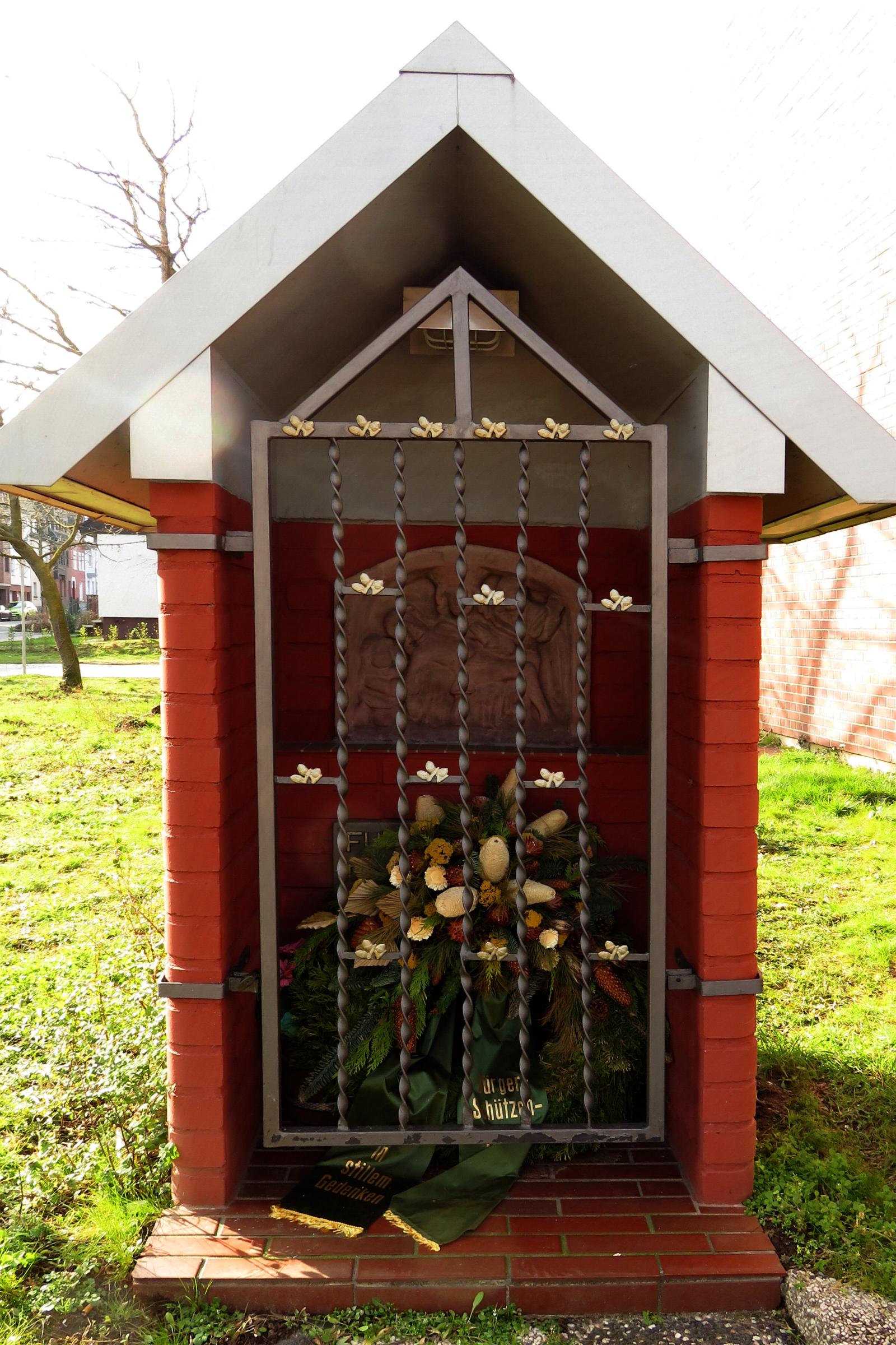 Standort: Das Mahnmal befindet sich neben dem Kircheneingang St. Hermann Josef an der Straßenecke Immelmannstraße / Kabelstraße, im Stadteil Mönchengladbach - Speick. Am Volkstrauertag ist hier die Kranzniederlegung zu Ehren der gefallenen und vermissten Soldaten der beiden Weltkriege. Die beiden Tafeln im Innern des Mahnmals weisen auf die Kriegsopfer und den Tod Jesus Christus hin.
