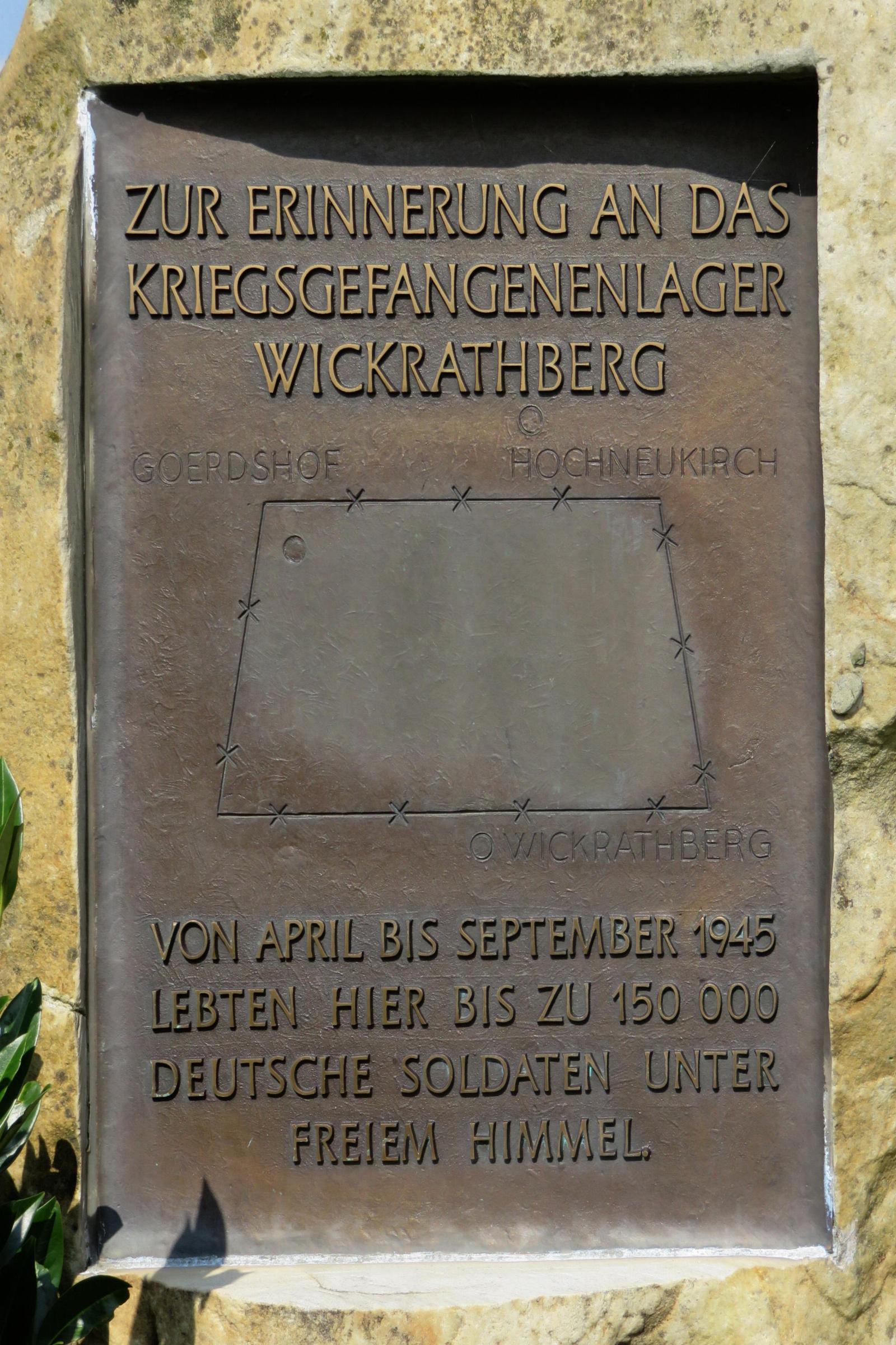 Standort: Der Gedenkstein zum Kriegsgefangenenlager befindet sich am Wickrather Weg im Stadtteil Mönchengladbach - Wickrathberg. Auf der Erinnerungstafel ist zu lesen: "Von April - September 1945 lebten hier bis zu 150 000 Deutsche Soldaten unter freiem Himmel. In dieser Zeit starben im Lager 226 Soldaten, die auf dem Wickrather Ehrenfriedhof beerdigt wurden. Der Gedenkstein wurde 1988 errichtet.