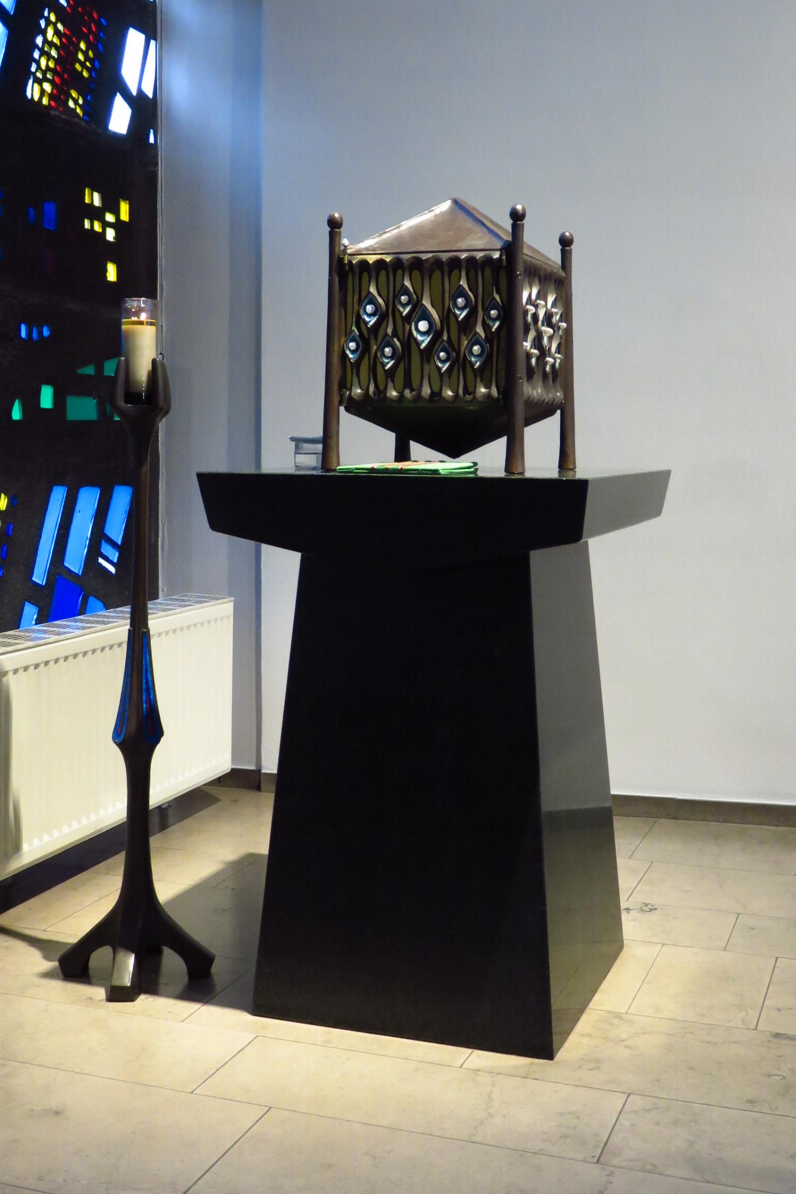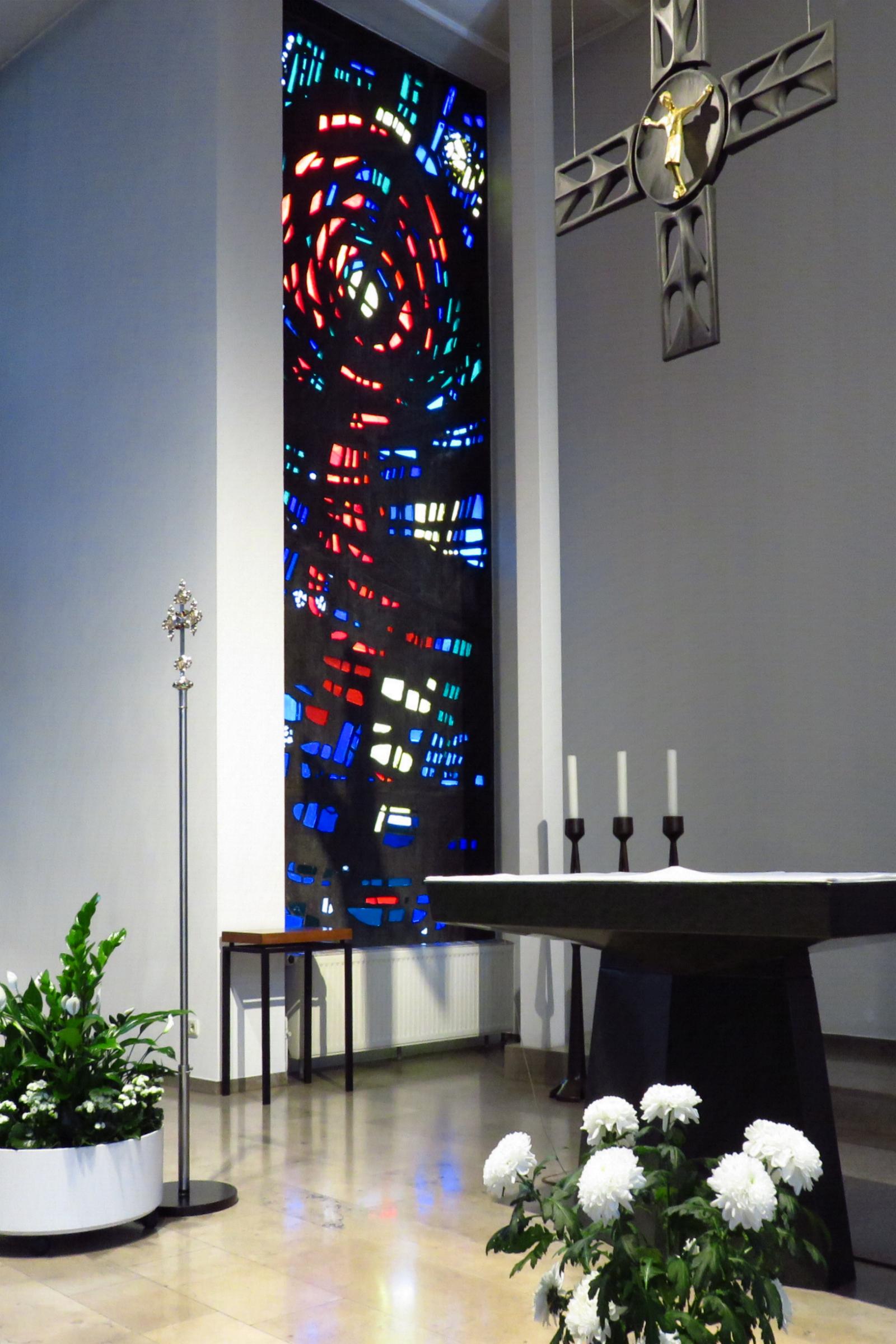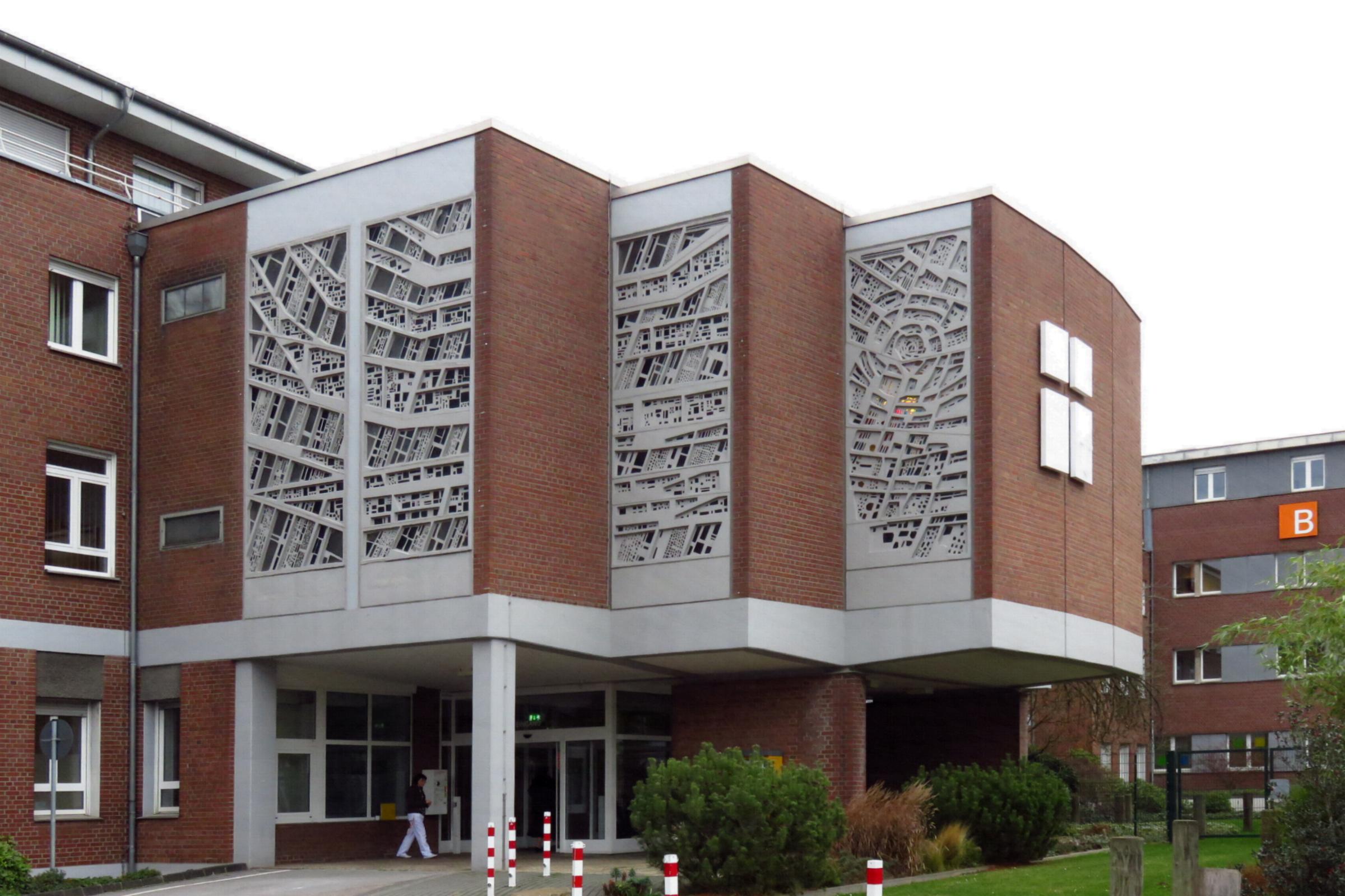 Architektur Bei der Krankenhauskapelle handelt es sich um einen zweigeschossigen Vorbau, der im ersten Geschoss beginnt. Unter der Kapelle im Erdgeschoss befindet einer der Krankenhauseingänge. Die Kapelle ist ein Betonskelettbau der von einem Flachdach bedeckt ist. Die Außenwände sind mit Ziegelsteinen verklinkert. Große Teile der Wände sind als Ornamentfenster mit Buntglas versehen und geben der Kapelle ein modernes aussehen. Über eine Treppe gelangt man zur Empore, auf der die Orgel gebaut ist.