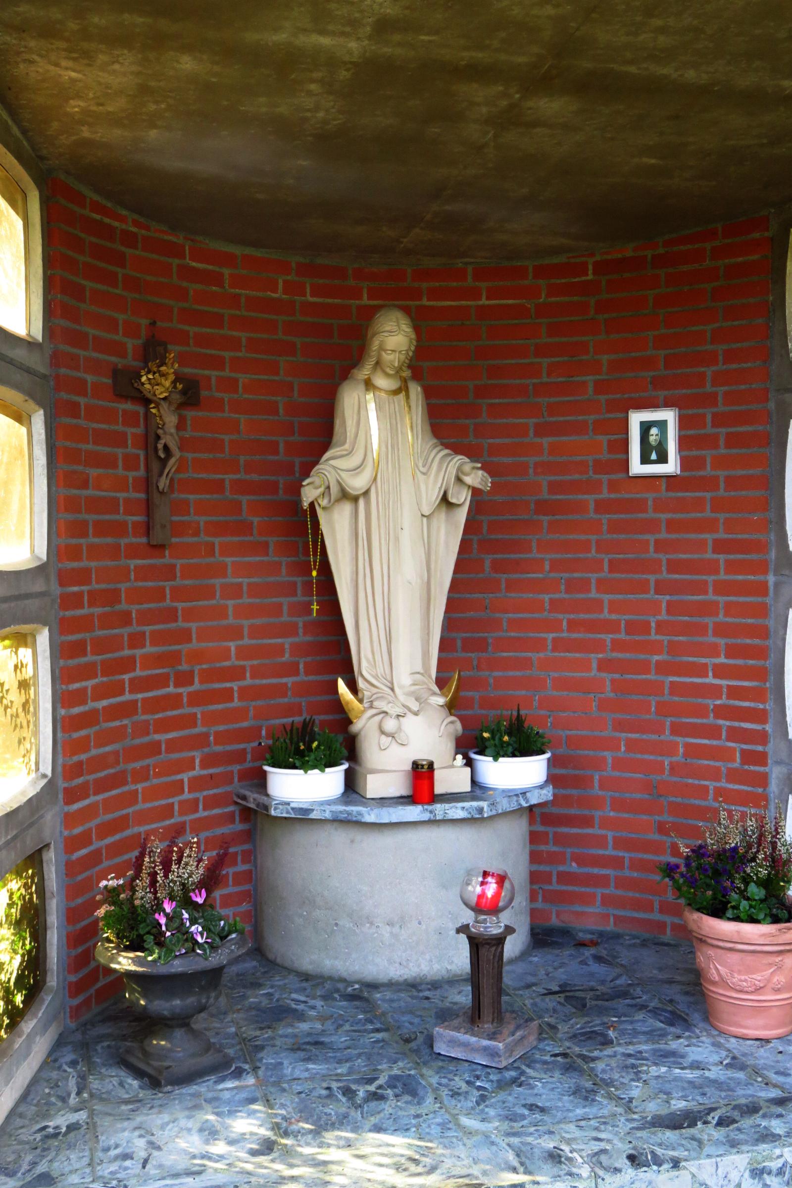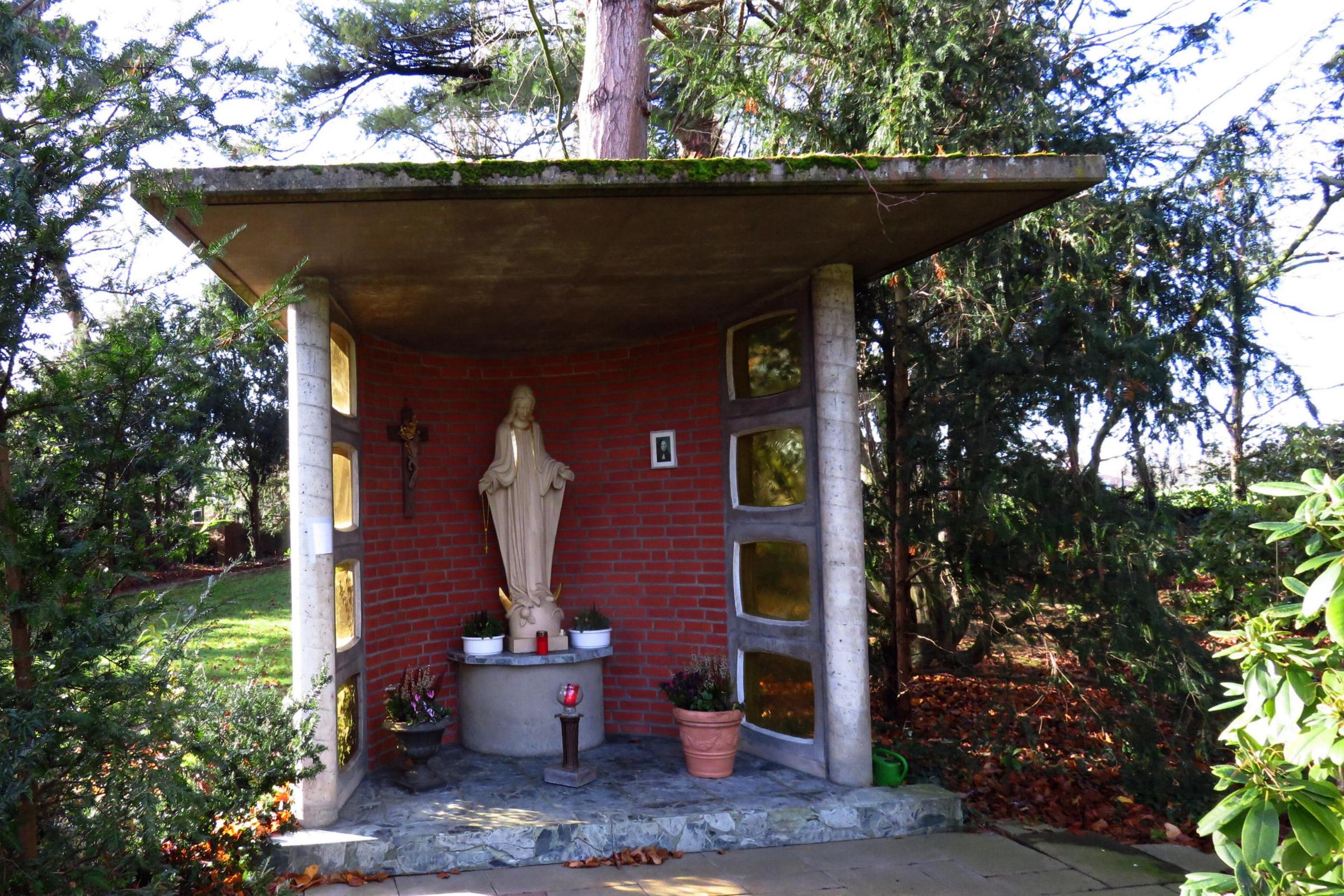 Standort: Die Muttergottes Kapelle befindet sich in der Parkanlage im Alten- und Pflegeheim St. Maria und hat ihren Standort in Heiligenpesch 84, im Stadtteil Mönchengladbach - Hehn. Geschichte: Das heutige Alten- und Pflegezentrum St. Maria in Hehn entstand aus dem Kloster der Armen Dienstmägde Jesu Christi aus Dernbach im Westerwald. Im Kloster war auch der Hauptsitz der linksrheinischen Ordensprovinz. Rund um das Kloster war eine weitläufige Park- und Gartenanlage. In den 1980 er Jahren wurde das Kloster zu einem Alten und Pflegeheim umgebaut. Im Jahr 2001 wurden die bestehenden Räumlichkeiten renoviert und modernisiert. In den folgenden Jahren wurde eine Erweiterung der Gebäude aus Platzgründen notwendig. Seit etwa 2010 sind am heutigen Pflegezentrum eine Tagespflegeeinrichtung sowie Betreutes Wohnen in der neuen Wohnanlage "Zum Alten Kloster" eingerichtet. Die Muttergottes Kapelle wird von Patienten und Besuchern der Parkanlage gerne besucht, um hier einen Moment in Stille und bei einem kurzen Gebet zu verweilen. Architektur: Bei der Kapelle handelt es sich um einen erkerähnlichen, dreiseitig geschlossenen Baukörper, der im Hinterbereich eine Backsteinwand aufweist. Rechts und links sind je vier verglaste Betonfensterrahmen eingebaut. Zwei Säulen und die Klinkerwand an der Rückseite tragen die trapetzförmige Betondecke. Ein Naturbruchsteinboden verleiht der Kapelle einen edles Aussehen.