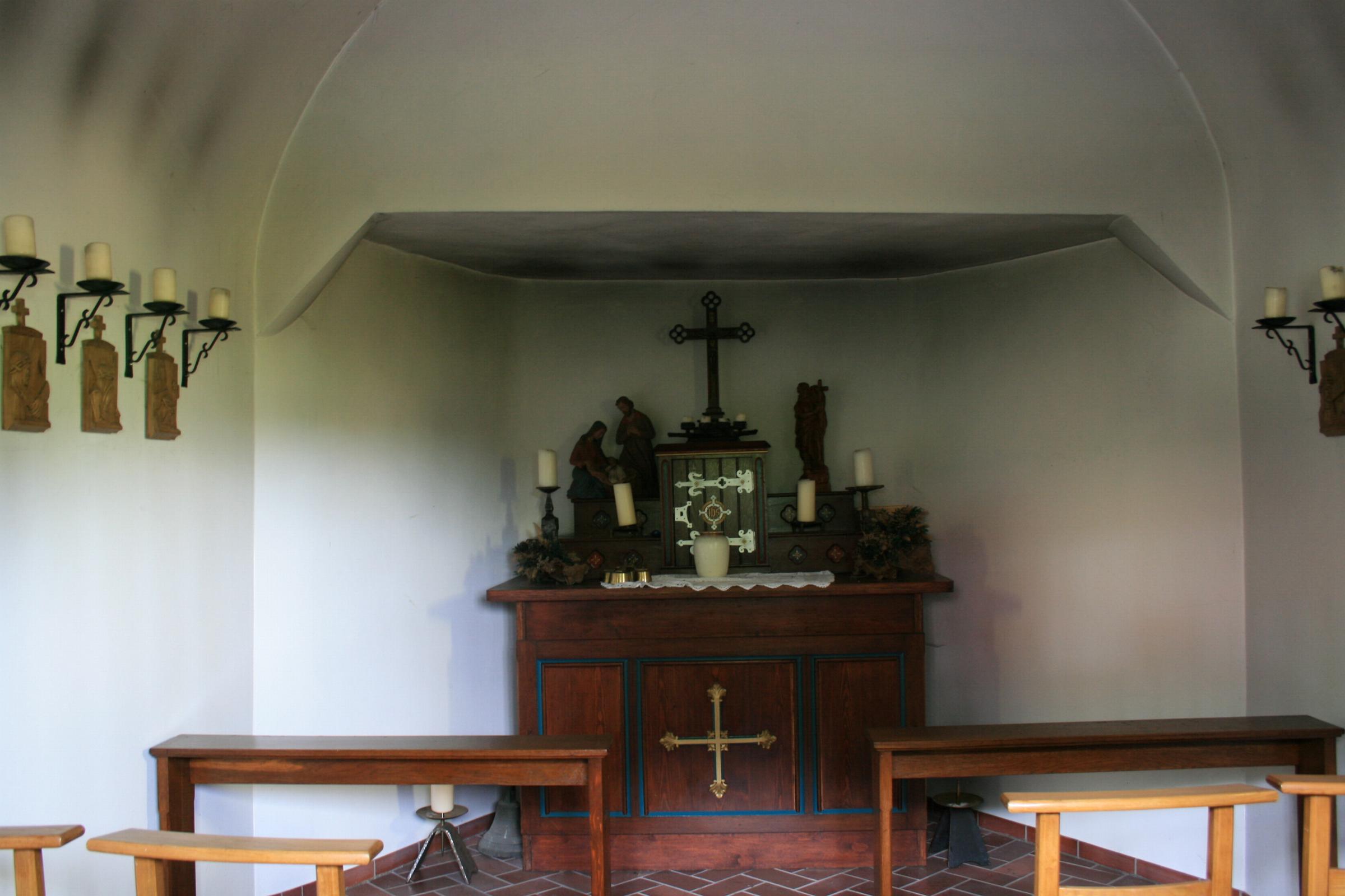 eines kleinen Wäldchens in Herdt. Die Fachwerkkapelle mit verputzten