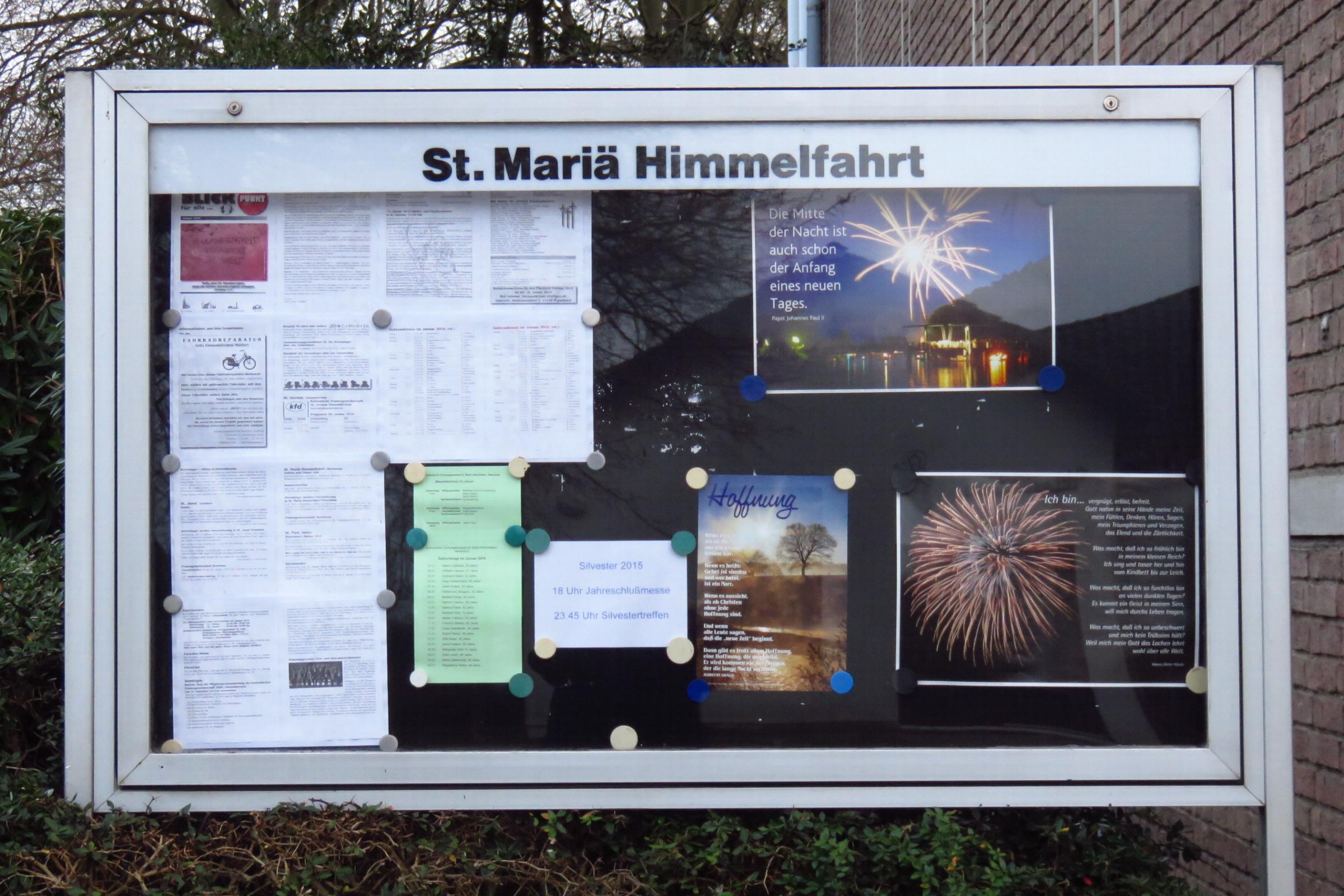 Standort: Die Kirche St. Mariä Himmelfahrt befindet sich in Meerkamp 100, im Stadtteil Mönchengladbach - Meerkamp Geschichte: Die 1956/57 erbaute Kirche wurde von Architekt Franz Schüren aus Mönchengladbach entworfen. Am 26. Mai 1957 war die feierliche Weihe. 1982 wurde die Kirche renoviert.