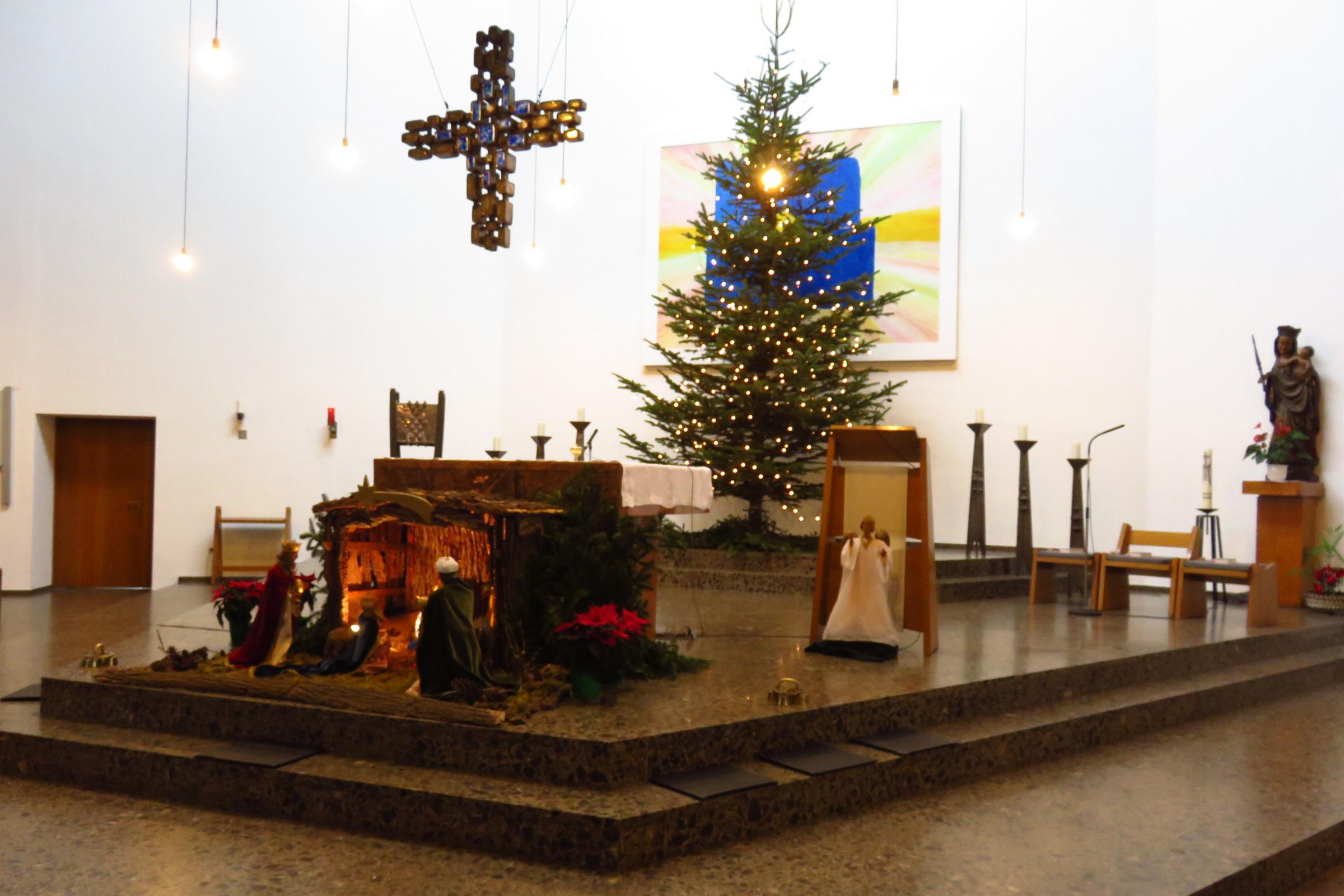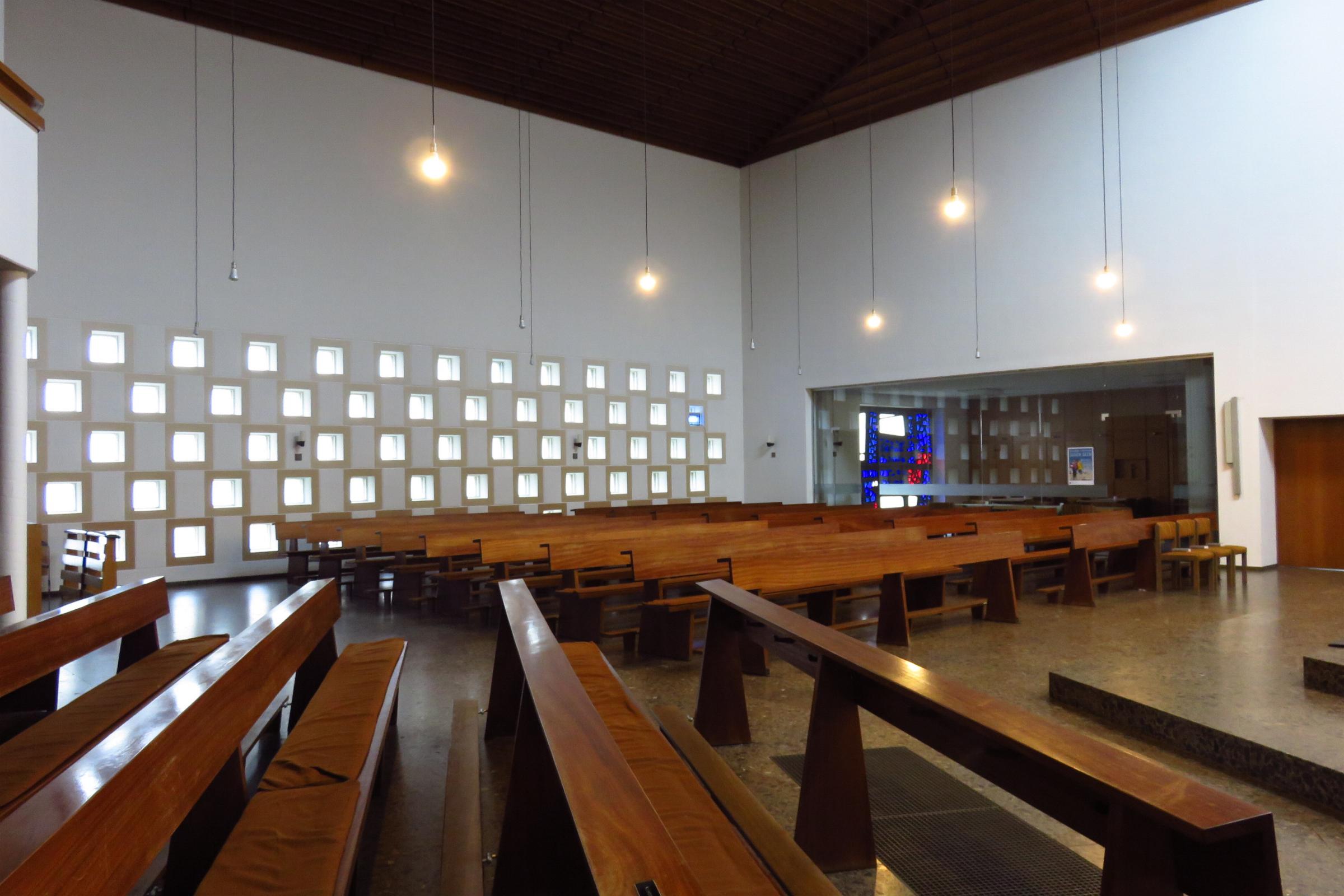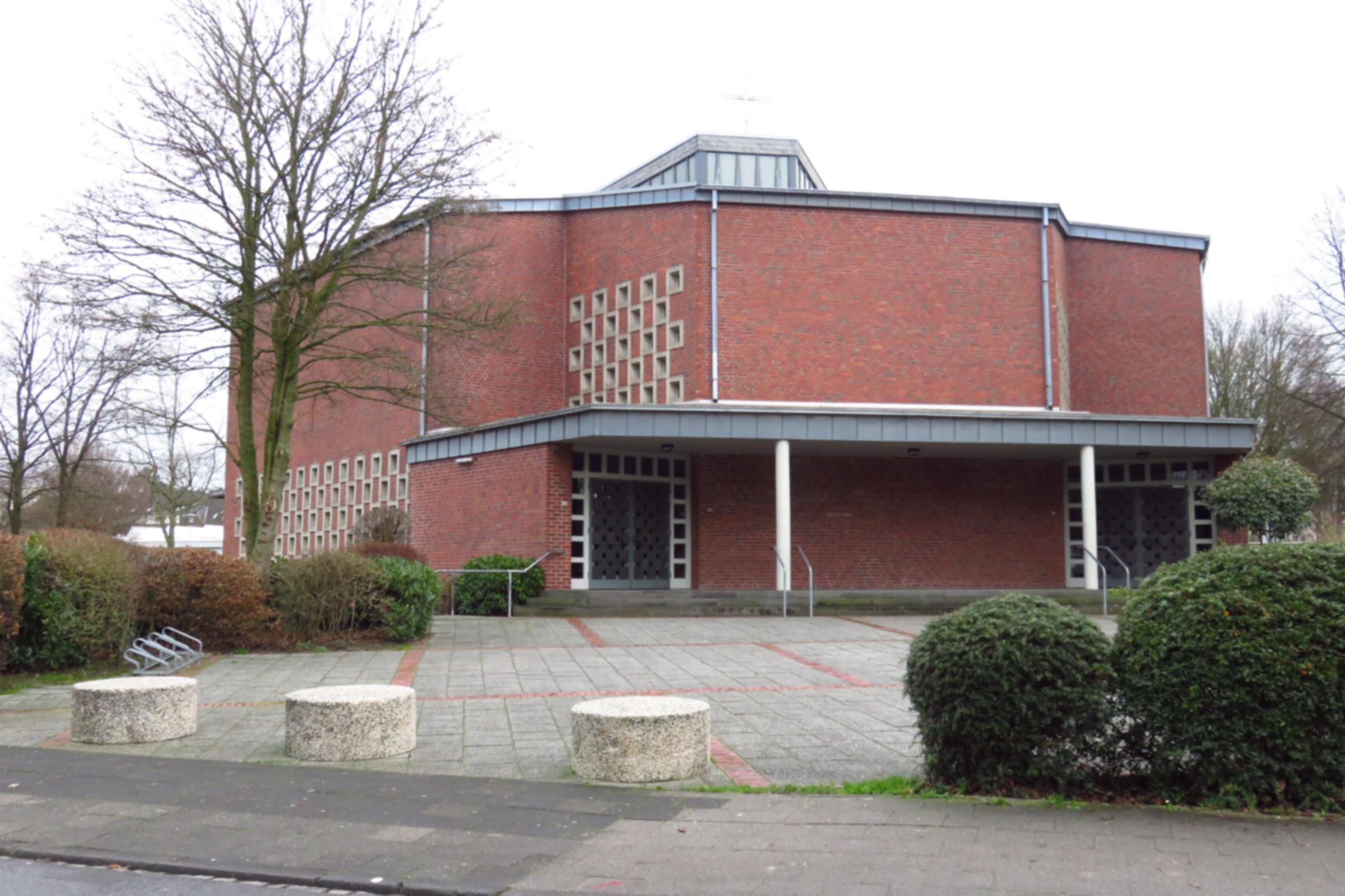 Geschichte: Die 1926 nach Plänen von Robert Hintzen gebaute Kirche wurde im Krieg am 31. August 1943 durch Brandbomben zerstört und notdürftig wieder hergerichtet. Am 6. November 1944 wurde die Kirche von Sprengbomben beschädigt, 1950 wiederaufgebaut und 1952 und 1957 verändert. 1964 wurde ein Neubau beschlossen, da die Kirche den Sicherheitsvorschriften nicht mehr entsprach. 1967/68 wurde die neue Kirche nach einem Entwurf von Gerhard Blume aus Rheydt errichtet. Die feierliche Weihe war am 15. Dezember 1968. 1989 wurde sie renoviert. Die alte Kirche wurde abgerisssen.