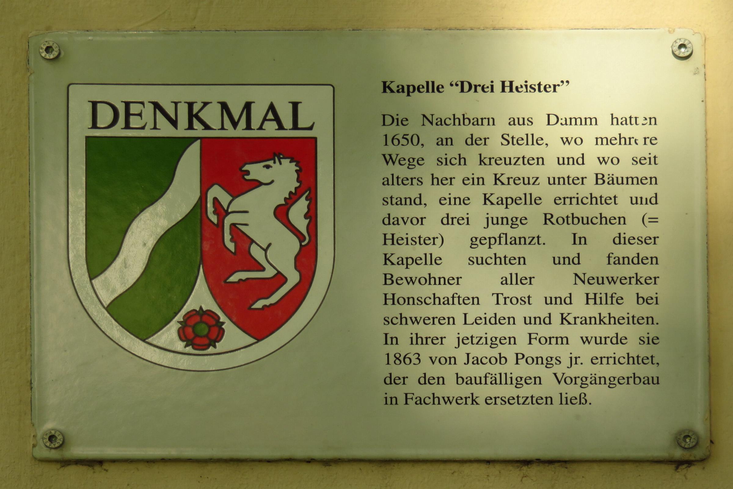 Ausstattung und Infos: * In der Kapelle ist ein Altar, ein Kruzifix, ein Heiligenbild, Heiligenfiguren, Kerzen und Blumenschmuck. Infos zur Kirche: * Denkmalliste Mönchengladbach Nr. K 035, Eintrag vom 2. Juni 1987 * Drei-Heister-Kapelle in neuem Glanz (RP-Online v. 1. Oktober 2010 (Genios)) * Die Dreiheister Kapelle in Neuwerk bei Wikipedia