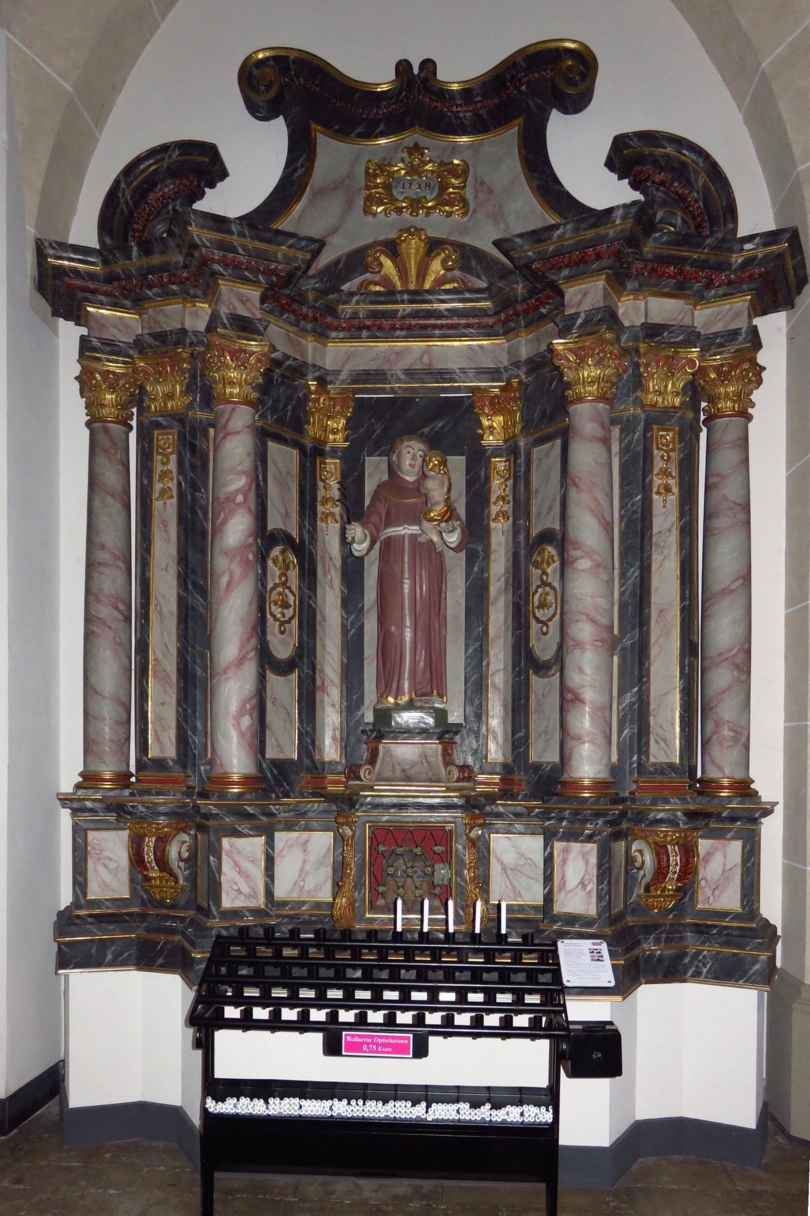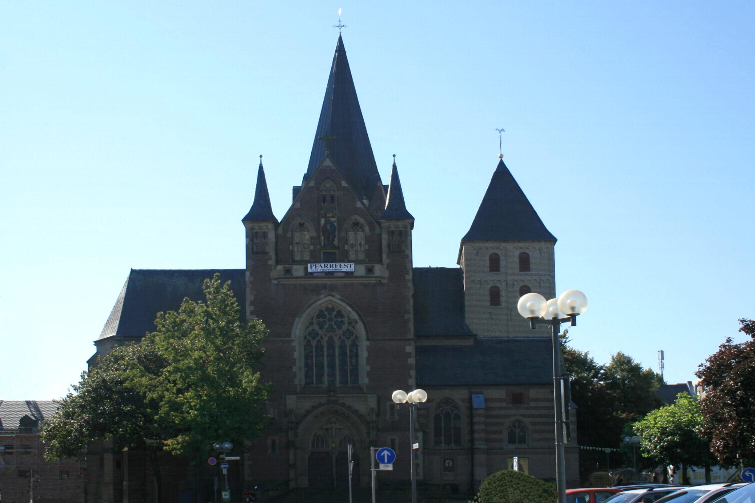 Geschichte: Die erste, bisher bekannte Kirche wurde im 12. Jh. als einschiffiger Bau mit runder Apsis und einem Westturm gebaut. Um 1400 war diese Kirche baufällig, so daß sie nach und nach bis 1510 durch einen dreischiffigen Neubau ersetzt wurde. Nur der Turm der alten Kirche blieb erhalten. Eine schon vor Mitte des 19. Jh. notwendige Erweiterung wurde 1911-14 durchgeführt. Die Pläne waren von Caspar Clemens Pickel aus Düsseldorf. An die Südseite der alten Kirche setzte man einen Backsteinbau, wobei zwei Joche des alten Langhauses beseitigt wurden. Der Turm aus dem 12. Jh. und der Chor aus dem 15. Jh. blieben erhalten. Am 30. Mai 1915 war die feierliche Weihe. Durch Sprengbomben und Artilleriebeschuß am 25. und 27. Februar 1945 erlitt die Kirche schwere Schäden. Nach der Wiederherstellung konnte am 14. September 1952 der neue Altar geweiht werden. 1965 wurde die Kirche renoviert und am 19. Juli 1965 ein neuer Altar geweiht.