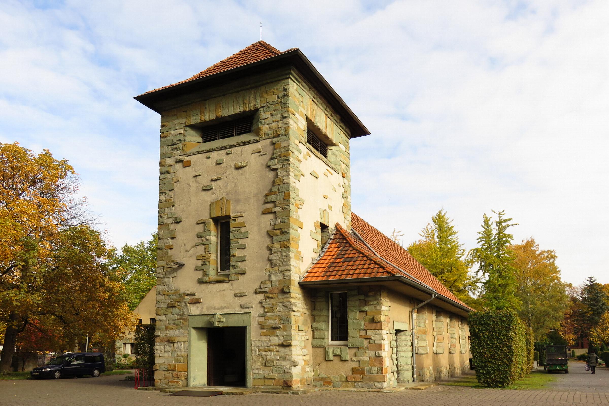 Denkmalbeschreibung: Auf dem im frühen 19. Jahrhundert angelegten und im weiteren Verlauf mehrfach erweiterten Gelände des evangelischen Friedhofs. Hier liegt die Friedhofskapelle, die mit ihrem Turmgeviert zentral auf die Hauptachse ausgerichtet ist, auf dem jüngsten, zur Nordstraße gerichteten Teilabschnitt. Der Gebäudekomplex der Totenhalle ist als winkelförmig gegliederte Anlage mit Nebengebäuden als gestalterisch geschlossenes Ensemble konzipiert und durchformuliert. Zentrum der kleinen Anlage ist der langgestreckte Kapellenbau, der östlich in den Zellentrakt mit 5 Sargkammern übergeht. Die Kapelle oder Totenhalle präsentiert sich als bodenständig wirkender Putzbau mit weit herabgezogenem Satteldach und massivem Turmgeviert an der westlichen Eingangsfront. Als Gliederungs- und Strukturierungselemente der Wandflächen sind durchgängig Natursteinverblendungen eingesetzt. So sind die Fenster aller Fassaden durch aufwendige Sandsteinrahmungen betont; analog ausgebildet sind die massiven Kantenstrukturen an allen Ecken sowie die umlaufenden Sockel. Als Hauptfassade ausgebildet ist die Eingangsfront mit dem vorgelagerten Turm, den ein weit vorkragendes Zeltdach überragt.