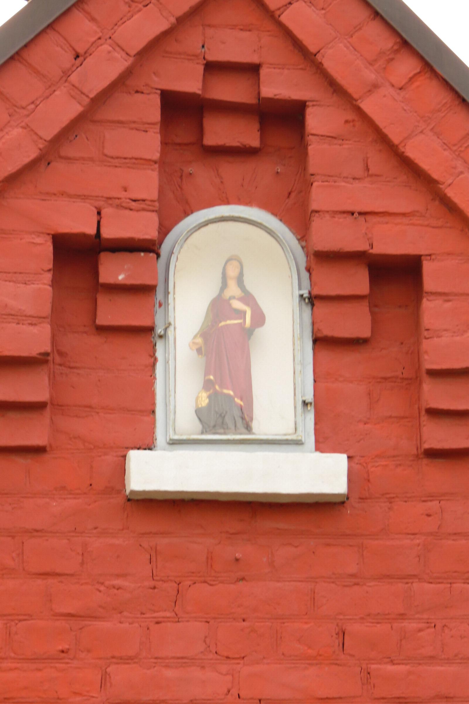 Der Eingang zur Kapelle ist spitzbogig. Das Dach ist mit Hohlziegeln an