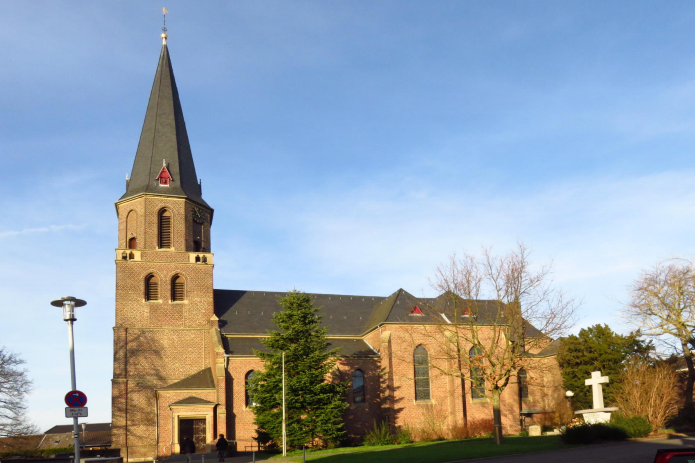 Geschichte: Im 13. Jahrhundert wurde eine dreischiffige Pfeilerbasilika gebaut. 1729 ist die Kirche im Osten verlängert und ein neuer Chor gebaut worden. Der Turm wurde 1752 errichtet. Ende des 19. Jahrhunderts reichte die Kirche für die Pfarre nicht mehr aus. Nach Plänen von Julius Busch aus Neuß, wurde 1898/1900 unter Pfarrer Adolph Plönis (1896-1908) an den Turm ein Neubau gesetzt und der Turm erhöht. Am 2. Oktober 1910 war die feierliche Weihe. Kriegsschäden aus 1945 waren 1958 behoben. Nach einem Brand im Jahr 1972 wurde die Kirche umgestaltet und 1986/89 renoviert.