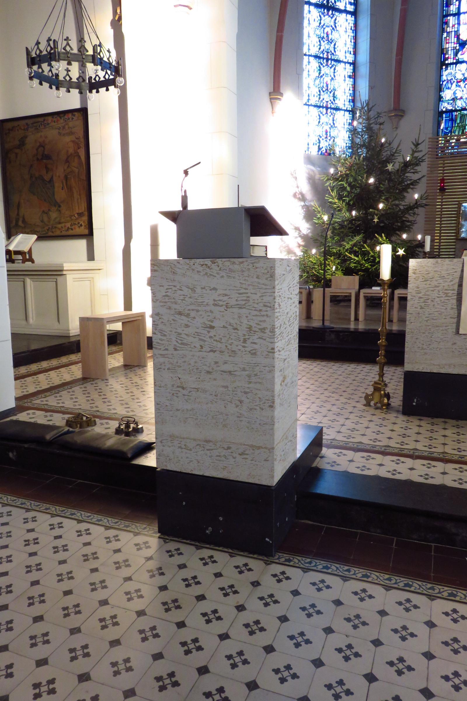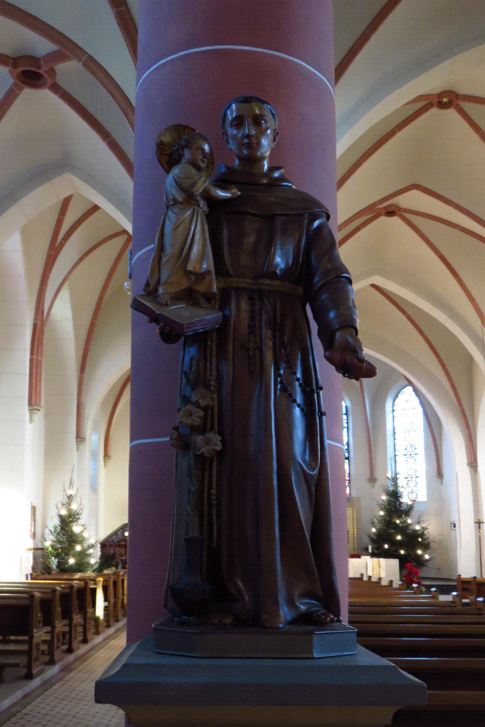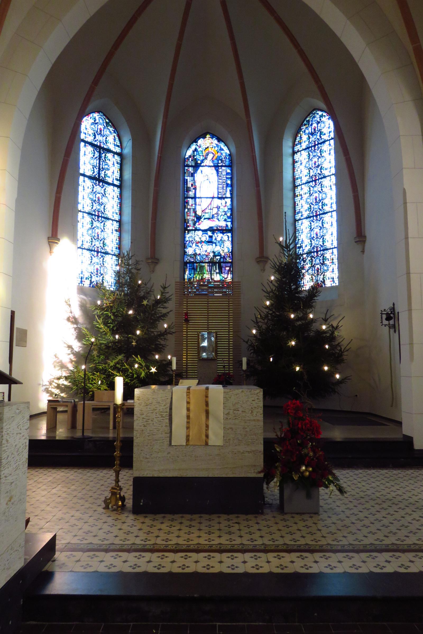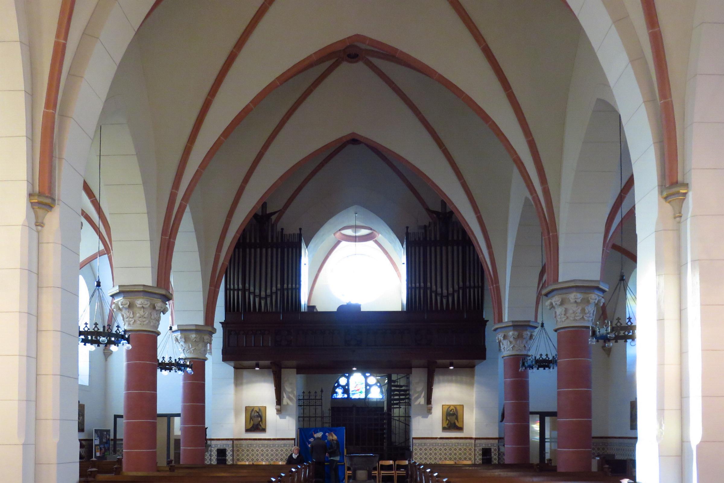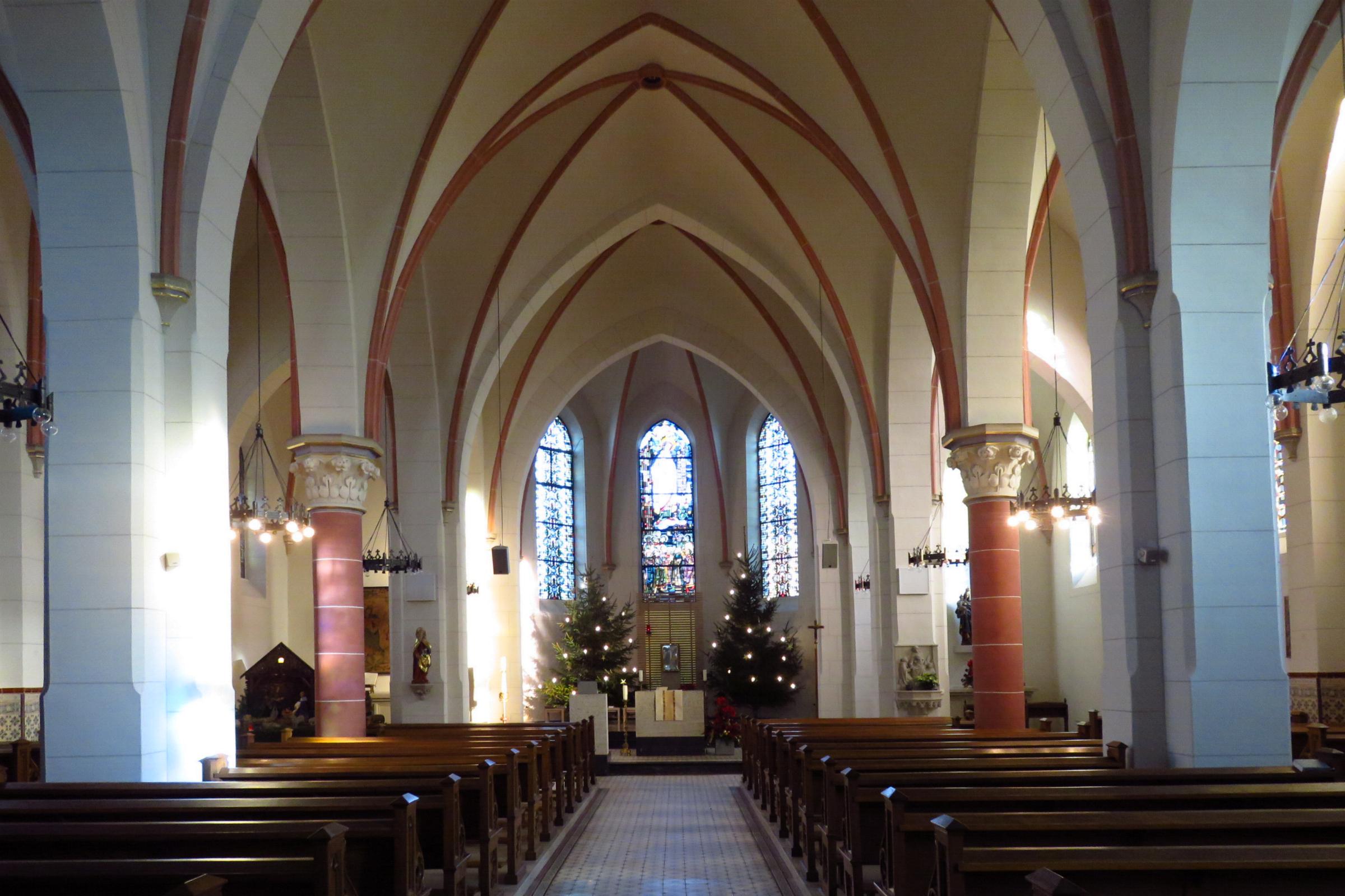 Ausstattung: * Die Kirche hat 380 Sitzplätze. * Am Kirchturm ist eine Uhr eingebaut. * In der Kirche sind ein Altar, ein Tabernakel, ein Taufstein, ein Verkündigungspult und Heiligenfiguren. * Die Orgel mit 14 Registern und einer pneumatischen Traktur, wurde 1930 von Fa. Stahlhuth aus Aachen gebaut. * Im Kirchturm befinden sich sechs Glocken aus den Jahren 1453, 1660, 1071 und 1973. * Die Kirche besitzt eine Buntverglasung