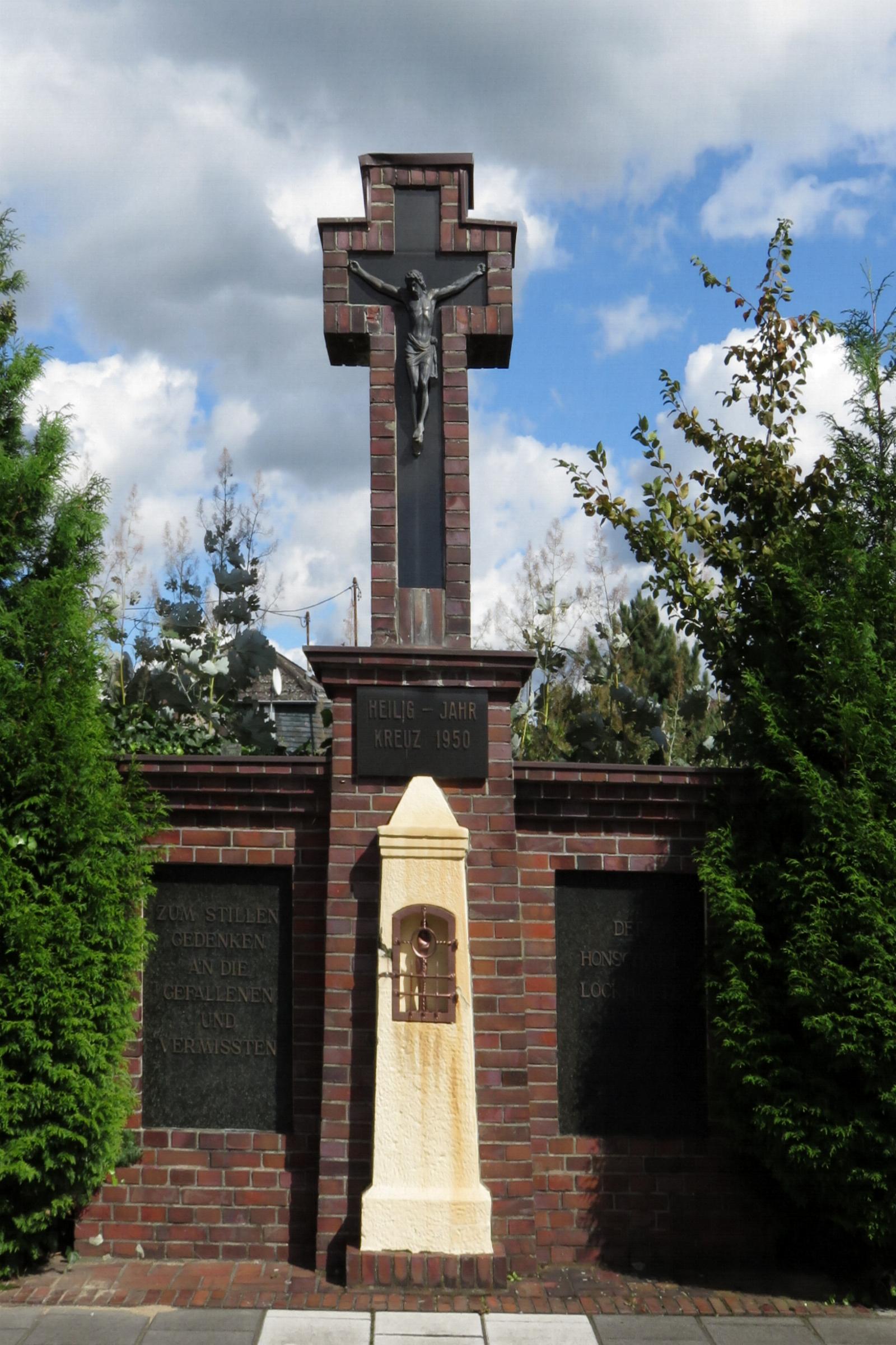 Denkmalbeschreibung: Das Kriegerehrenmal liegt jenseits der Autobahnbrücke unmittelbar vor der Stadtgrenze in Richtung Viersen. Die schlicht gegliederte Backstein-Anlage besteht aus einem massiv gemauerten Schaftkreuz mit einem Christuskorpus aus Bronzeguß auf einem traditionellen Pfeilersockel, der in ein hohes, altarähnliches Podest mittig eingebunden ist. Rechts und links zwei Marmor-Inschriftentafeln: links: "Zum stillen Gedenken an die Gefallenen und Vermissten rechts: der Honschaft Lockhütte." Die ursprünglich aufgeführten Namen der Gefallenen des Ortsteils wurden später entfernt. In den kreuztragenden Mittelpfeiler ist ein Fußfall aus dem Anfang des 18. Jahrhunderts eingelassen. Er ist aus Liedberger Sandstein und mittig betont durch eine mit Metallgitter verschlossene Heiligennische. In der Nische eine 1981 von einer Frau Elisabeth Heitzer gestiftete Madonnenfigur. In einer Urkunde, die in die Anlage eingeschlossen wurde, wird der frühere Standort des Fußfalles angegeben: an der alten Heerstraße von Neuss nach Viersen in Höhe des ehemaligen Piperhofes in Bettrath - Lockhütte. Die Unterschutzstellung liegt daher aus ortsgeschichtlichen Gründe im öffentlichen Interesse. * Denkmaleintrag der Stadt Mönchengladbach Nr. Z 004 vom 22. Januar 1997