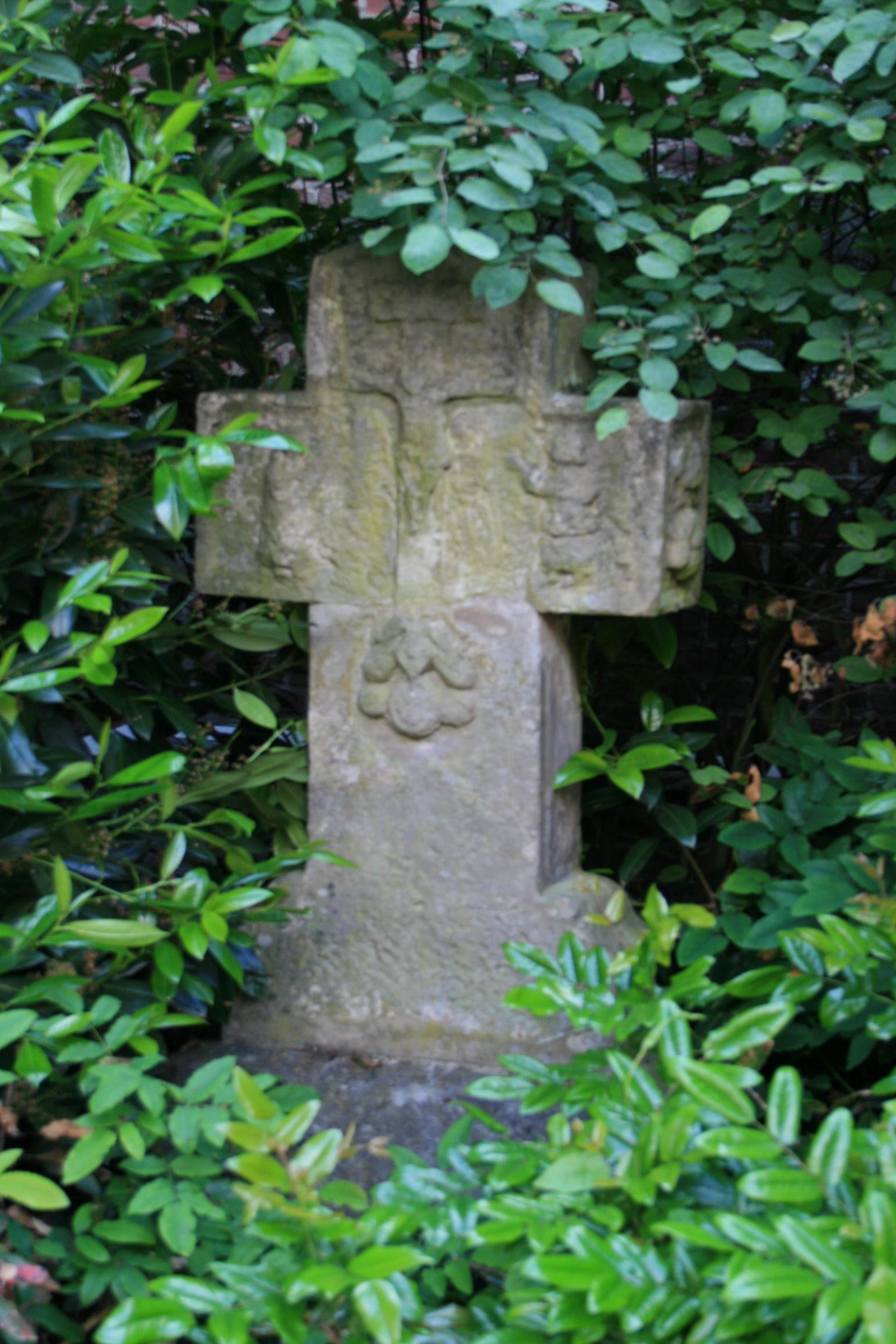 Standort: Das Wegekreuz hat seinen Standort in der Borrengasse an der Kirche im Stadtteil Mönchengladbach - Giesenkirchen. Das Wegekreuz steht in der Denkmalliste der Stadt Mönchengladbach mit der Nr. B 173 unter Denkmalschutz. Denkmalbeschreibung: In der Borrengasse, vor der Südostwand der Pfarrkirche St. Gereon, unmittelbar am Konstantinplatz in MG-Giesenkirchen steht das Wegekreuz aus Liedberger Sandstein steht auf einem jüngeren Sockelstein, die Basis zeigt eine einfache Karniesprofilierung, die in einen breiten Kreuzstamm mit kurzen Kreuzarmen und giebelförmigem Abschluss übergeht. Die vertieft ausgearbeitete Ansichtfläche zeigt eine gespitzte Überarbeitung und wird von einer rahmenden Leiste gefasst. Sie trägt eine flache Reliefdarstellung, aus einer Konsole erwächst ein Kreuz mit dem Gekreuzigten, das von flankierenden Figuren auf den beiden Kreuzarmen, vermutlich der Hl. Maria und dem Hl. Johannes, begleitet wird. Die beiden Seitenflächen des horizontalen Kreuzbalkens tragen je einen geflügelten Puttenkopf über einem festonartigen Zierelement. Auf der Rückseite findet sich die tief eingeschlagende Inschrift, die nach Unterlagen im Giesenkirchener Pfarrarchiv zu lesen ist: "Ann 1703, den 20. Januar ist Wilhelm Knabben im Herrn entschlafen. Gewesener Scheffen zur Tick 6.D.T.S." Das Objekt ist bedeutend für die Geschichte des Menschen. An seiner Erhaltung und Nutzung besteht ein öffentliches Interesse aus kunsthistorischen, ortsgeschichtlichen und volkskundlichen Gründen. Das Objekt ist als Baudenkmal schützenswert. * Denkmaleintrag der Stadt Mönchengladbach Nr. B 173 v. 28. Juli 2009
