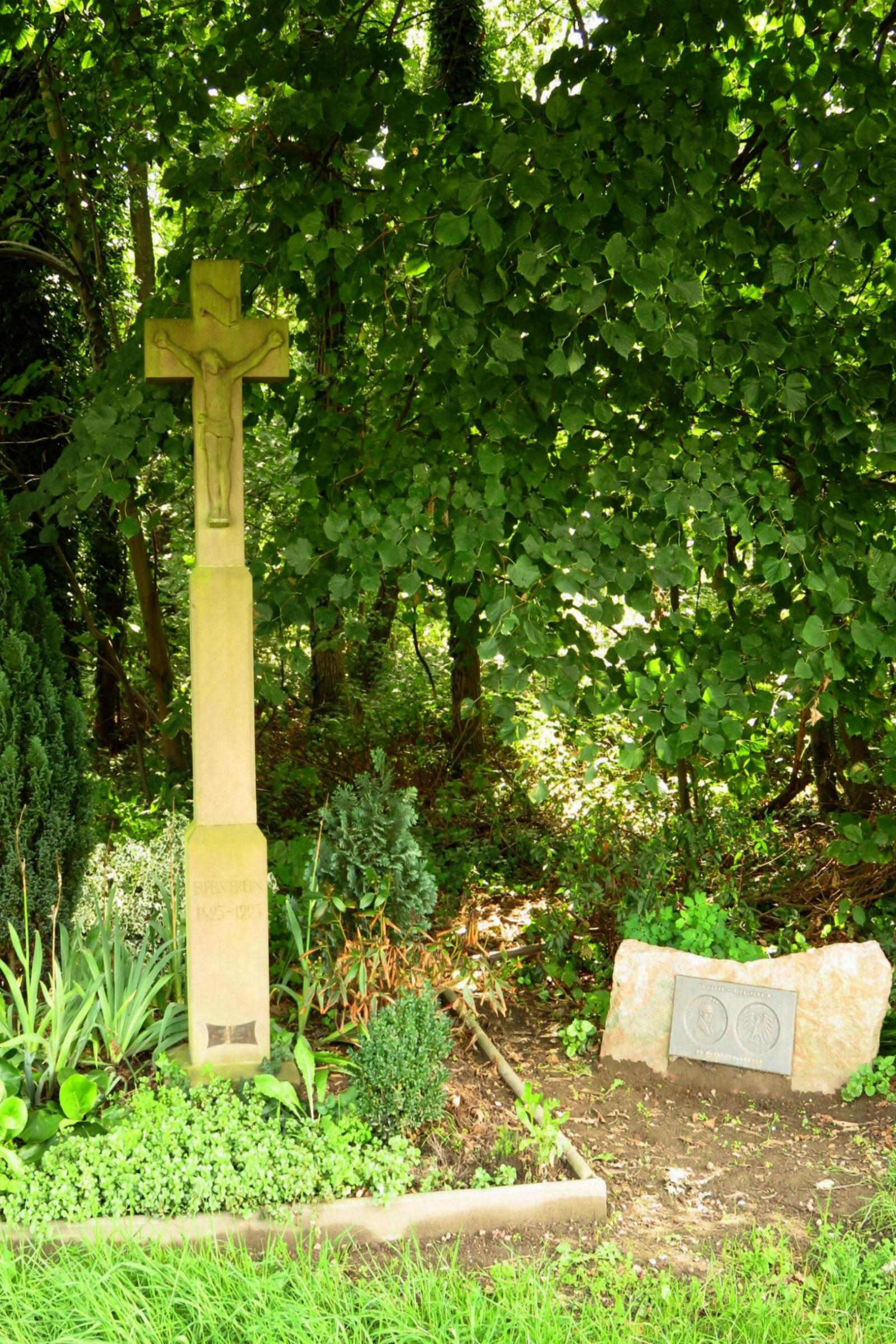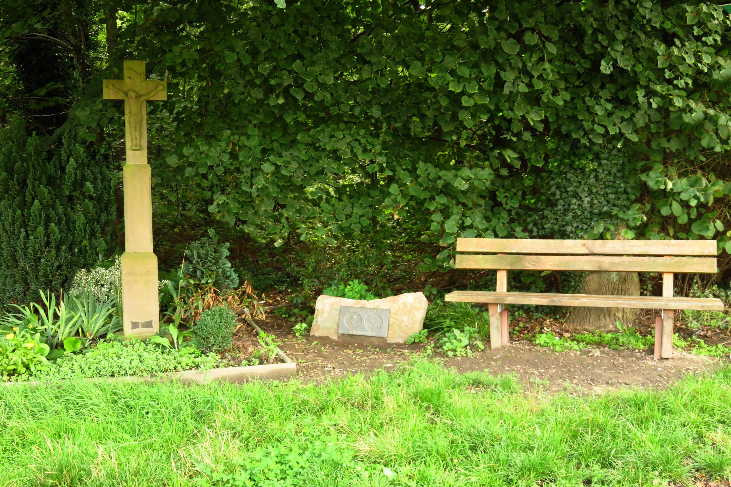 Geschichte: Am Ende des Heilstättenweges steht links am Waldrand ein Steinkreuz auf einem schlanken Sockel mit einem plastisch aus dem Stein herausgearbeiteten Korpus. Es stammt aus einer Steinmetzwerkstatt an der Ahr. Dort wurde es 1994 von einer Wandergruppe des Eifelvereins entdeckt und aus Anlass des Vereinsjubiläums als Wegekreuz errichtet. Darauf verweist die im unteren Sockel befindliche Inschrift: "Eifelverein 1893-1993." Das Wegekreuz stand ursprünglich an der Landwehr in Ohler und wurde im Rahmen einer ökumenischen Feier am 15.5.1994 durch die Pfarrer Josephs und Kirca eingeweiht. Aber schon bald wurde es mehrfach beschmutzt und beschädigt. Der Eifelverein entschied sich für eine Restaurierung und eine Umsetzung zum Heilstättenweg. Eine kleine Metalltafel am unteren Sockel trägt den Hinweis. "Restauriert 1998." Dieses Kreuz ist ein beispielhaftes Zeichen, dass auch in der jüngeren Zeit an der alten Tradition der Wegekreuze festgehalten wird, trotz der negativen Erfahrungen am ersten Standort. Text aus Sakrale Kleindenkmäler - Wegekreuze in Mönchengladbach. Nr. 22 von Heinz Habrich - Klaus Hoffmann * Der Eifelverein Mönchengladbach O G