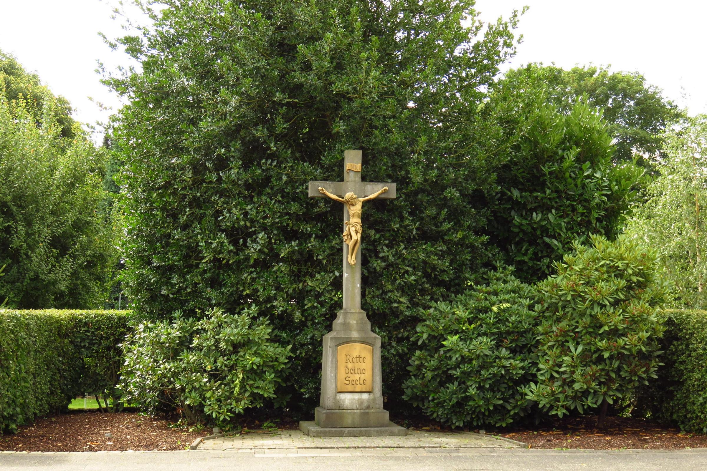 Standort: Das Missionskreuz hat seinen Standort an der Vorster Straße 173 im Stadtteil Mönchengladbach - Hardt. Geschichte: Auch dieses Kreuz erinnert an eine Mission, jedoch ist nicht bekannt, an welche. Dem Typus nach stammt es aus dem 19. Jahrhundert. In einer kleinen Grünanlage stehend erhebt sich über dem schlichten Sockel ein Schaftkreuz mit Holzkorpus. Im Sockel ist eine Holzplatte mit der Inschrift: "Rette deine Seele" eingelassen. Ursprünglich war es eine Marmortafel, die aber im Krieg verloren ging. Das Kreuz stand auf drei Sockelstufen, da aber nach Abbau der Straßenbahnschienen die Straße verbreitert und höher gelegt wurde, gibt es nun nur noch eine Stufe. Die hinter dem Kreuz stehen Rotbuche wurde 1910 gepflanzt. Nach Überlieferung durch Zeitzeugen ist bekannt, dass bei einem Sterbefall hier der Rosenkranz gebetet wurde.und am Wochenende nach dem Begräbnis ging die Nachbarschaft zu einem Bittgang zur Gottesmutter nach Hehn. Kreuz und Anlage sind sorgfältig gepflegt, dafür sorgen die Bewohner der Nachbarschaft. Text aus Sakrale Kleindenkmäler - Wegekreuze in Mönchengladbach. Nr. 20 von Heinz Habrich - Klaus Hoffmann