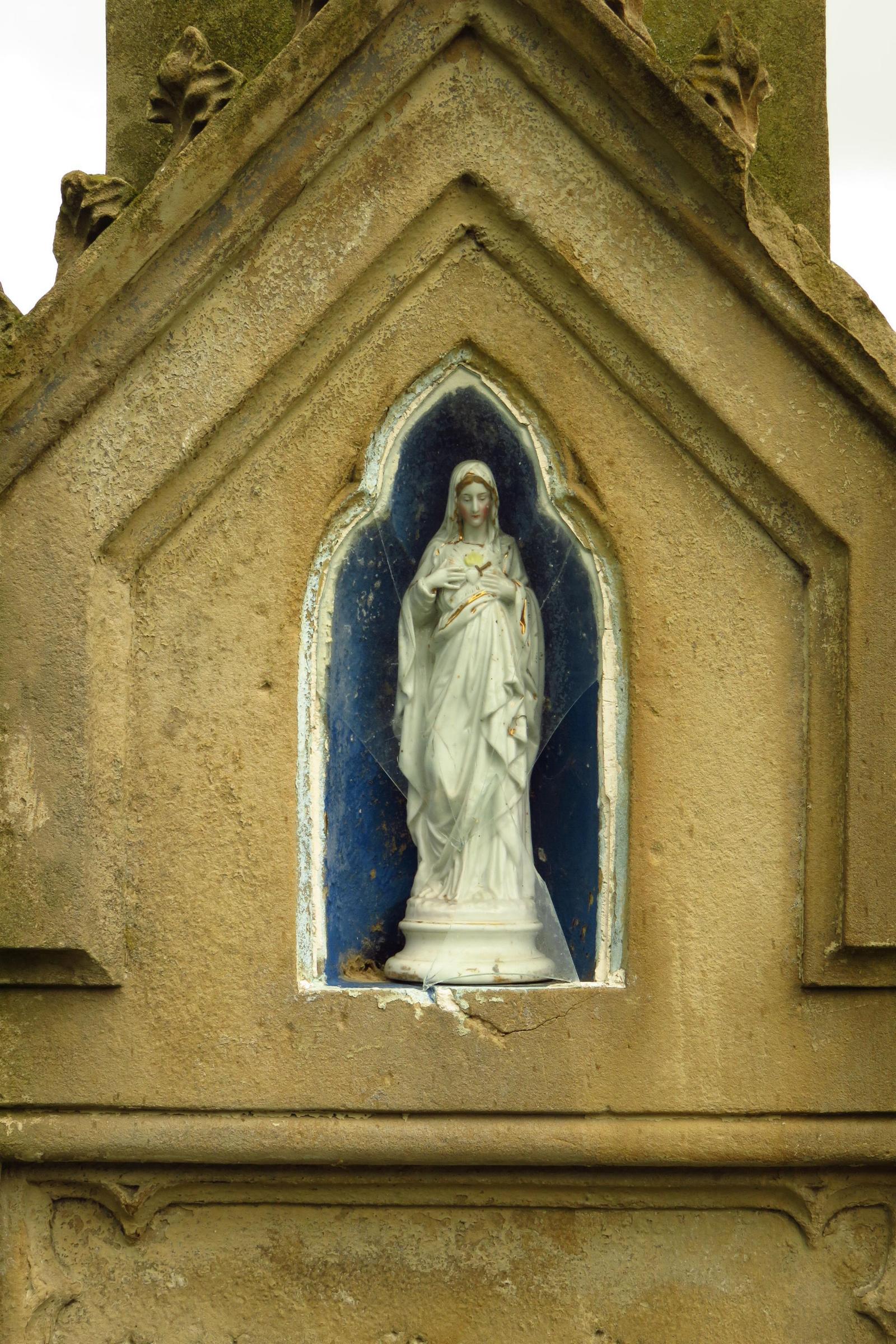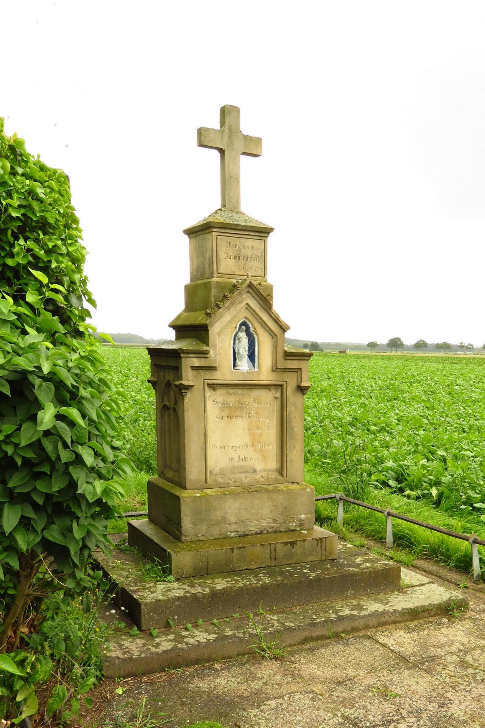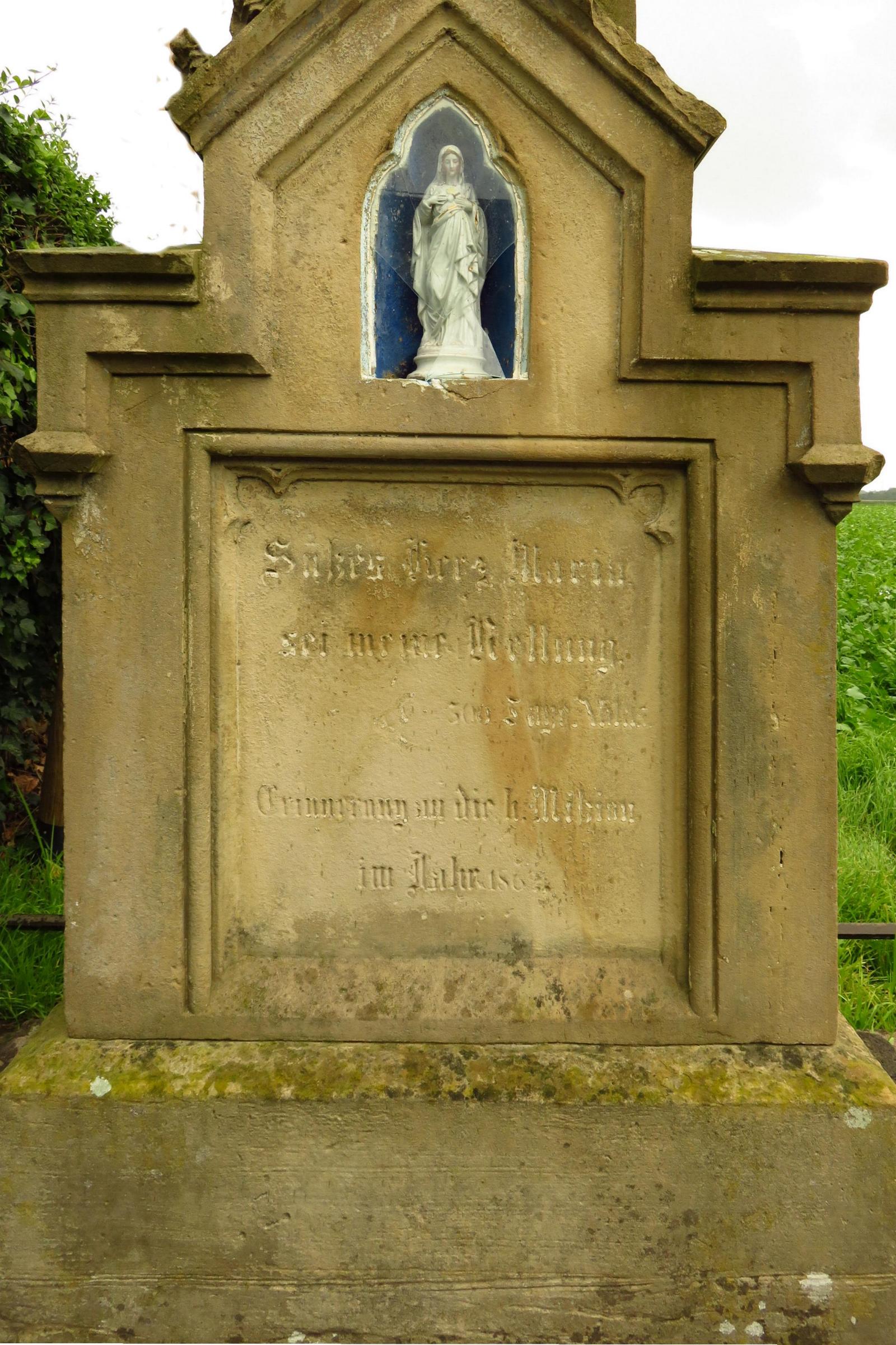 Das Missionskreuz im Weiler Wey ist ein kleines schlichtes Steinkreuz auf einem mächtigen, mehrfach gestuften Sockel. Der Steinsockel weisst Schäden auf und die Inschriften sind nur schwer zu entziffern. Direkt unter dem Kreuz ist im Sockel eingraviert: "Mein Jesus Barmherzigkeit. 100 Tage Ablass". In einer Nische, blau ausgemalt und verglast, steht eine Madonnenfigur aus Porzelan. Darunter befindet sich eine weitere Inschrift: "Süßes Herz Maria sei meine Rettung. 300 Tage Ablass. Erinnerung an die Hl. Mission 1862". Die Geschwister Johann Heinrich und Judith Klöters, wohlhabende und unverheiratete Landwirte, haben das Kreuz anlässlich einer Mission im Jahre 1860 gestiftet.. Über den Verbleib des hölzernen Korpus, er soll 100 cm groß gewesen sein, ist nichts bekannt. Nach Kreigszerstörungen wurde das Kreuz erneuert. Eine Instandsetzung erfolge im Jahre 1972. Text aus Sakrale Kleindenkmäler - Wegekreuze in Mönchengladbach. Nr. 16 von Heinz Habrich - Klaus Hoffmann