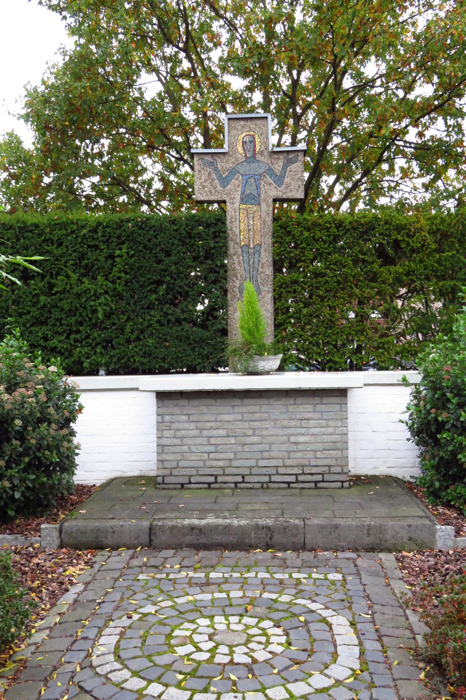 Standort: Das Mosaikkreuz hat seinen Standort in der Ortsmitte von Poeth, im Stadtteil Mönchengladbach - Poeth. Geschichte Das alte Dorfkreuz verfiel durch Witterungseinwirkung. Die Bewohner planten ein neues Kreuz als Mahnmal für die Gefallenen der beiden Weltkriege und als Segensaltar für die Frohnleichnamsprozession. Der Altar wurde aus Klinkersteinen errichtet und ein mächtiger, ca drei Meter hohes Zementkreuz trägt das als Mosaik aufgeführte Bild Jesu mit dem Heiligenschein, aber ohne Dornenkrone. Das Mosaik wurde 1960 von der Künstlerein Marianne Hilgers ausgeführt. Pfarrer Dr. Müller lobte bei der Einweihung das Engagement der Bewohner, die das Kreuz als Zeichen des Glaubens errichten und im Christentum eine Kraftquelle für ihr Leben sehen. Das neue Kreuz soll in der Tradition des alten Dorfkreuzes stehen und Mittelpunkt der Ortsgemeinschaft sein. Text aus Sakrale Kleindenkmäler - Wegekreuze in Mönchengladbach. Nr. 25 von Heinz Habrich - Klaus Hoffmann