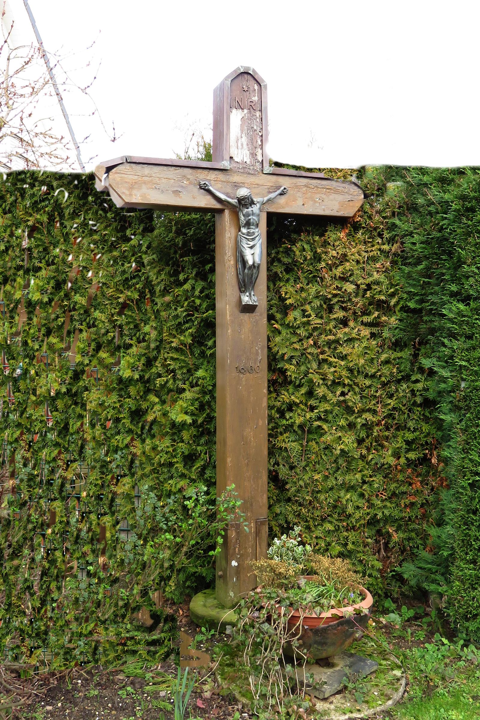 Standort: Das Holzkreuz hat seinen Standort am Steinforther Weg, im Stadtteil Mönchengladbach - Schelsen. Geschichte: Der Bauer Heinrich Nilgen aus Schelsen fand auf einem Schrottplatz ein altes Kreuz und entschloss sich, mit Hilfe seines Nachbarn den Korpus aufzurichten. Er wählte dafür einen Platz in unmittelbarer Nähe seiner Scheune und den Schweineställen, die inzwischen längst einer Wohnbebauung gewichen sind. Es ist ein Holzkreuz mit Giebeldach und einem Metallkorpus, es trägt die Jahreszahl 1960 und wird von der Nachbarschaft gepflegt. Der Standort liegt am Rande der Bebauung vor den Feldern in Richtung Steinforth und ist selbst vielen Bürgern des Ortes nicht bekannt. Text aus Sakrale Kleindenkmäler - Wegekreuze in Mönchengladbach. Nr. N 2 von Heinz Habrich - Klaus Hoffmann