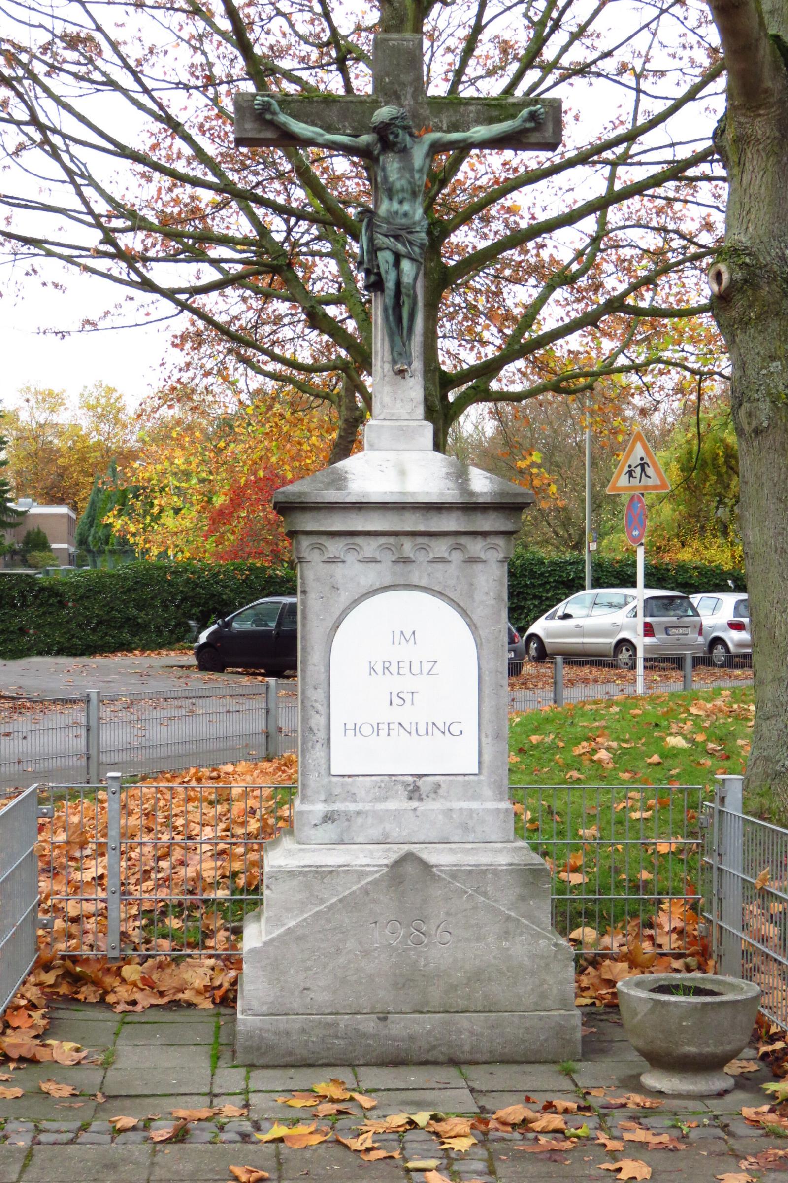 Standort: Das Wegekreuz befindet sich an der Straßenmündung Ferdinand-Strahl-Straße / Aachener Straße im Stadtteil Mönchengladbach - Westend. Geschichte: Unter Bäumen am Rand eines kleinen Platzes steht ein Steinkreuz mit einem Korpus auf Kupfer, der eine grünliche Patina aufweist. Der gegliederte, blockhafte Unterbau trägt eine Platte in einer rundbogigen Nische. Die Inschrift lautet: "Im Kreuz ist Hoffnung". 1986 wurde das Kreuz aus alten Teilen zusammengestellt, die vermutlich aus dem 18. Jahrhundert stammen. Text aus Sakrale Kleindenkmäler - Wegekreuze in Mönchengladbach. Nr. 31 von Heinz Habrich - Klaus Hoffmann