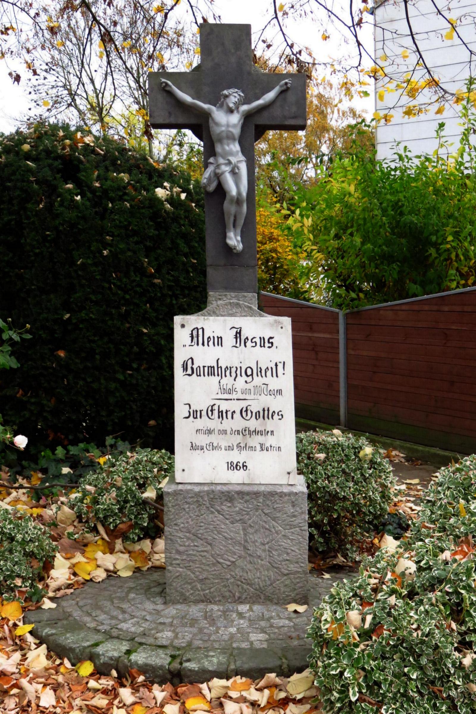Standort: Das Wegekreuz hat seinen Standort an der Straßenecke Lindenstraße / Ebelshof , im Stadtteil Mönchengladbach - Windberg. Geschichte: Es geschied nicht selten, dass ein Wegekreuz von seinem ursprünglichen Standort weichen muss. So ist es auch bei diesem Kreuz aus dem Jahre 1866, das von einem Ehepaar gestiftet wurde. Zuerst stand es am Ebelshof, dem Besitz der Stifter. Als der Hof 1960 abgerissen wurde, wanderte es zum alten Pastorat auf der Annakirchstraße, bis auch hier der Abriss erfolgte. Das Kreuz wurde abgebaut und eingelagert und Anfang der 80er Jahre an der Außenwand der Windberger Kirche wieder aufgestellt. Im Mai 1991 fand es einen Platz an einer Straßenkreuzung unweit der Stelle, wo sich bis nach dem Zweiten Weltkrieg der alte Bauernhof befand. Ein behauener Sockel aus Granit, der ursprünglich höher war, trägt ein Mittelteil, darüber erhebt sich ein Kreuz mit Korpus. Die Inschrift lautet: "Mein Jesus Barmherzigkeit. Ablaß von 100 Tagen. Zur Ehre Gottes errichtet von den Eheleuten Adam Ebels und Helene Watrim 1866." Text aus Sakrale Kleindenkmäler - Wegekreuze in Mönchengladbach. Nr. 36 von Heinz Habrich - Klaus Hoffmann