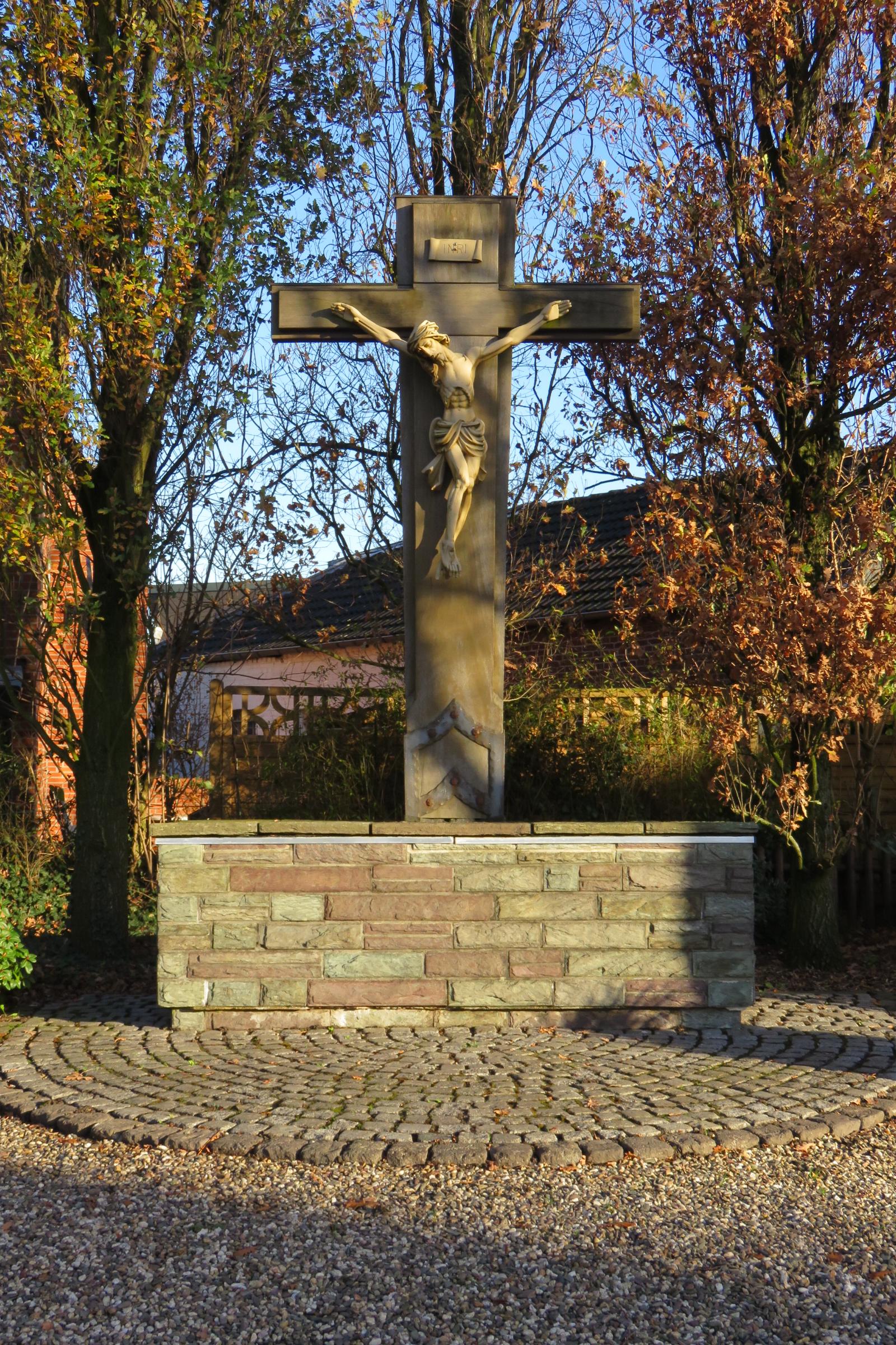 Standort: Das Dorfkreuz hat seinen Standort an der Winkelner Straße am Kreisverkehr, im Stadtteil Mönchengladbach - Winkeln. Es ist auch Teil der Gedenkstätte Geschichte: Ein erst 1869 errichteten Dorfkreuz musste 1963 wegen Veränderung der Straßenführung abgebrochen werden. Sofort planten die Bewohner ein neues Dorfkreuz, unweit des früheren Standortes. Dort stand durch eine großherzige Schenkung an die Kirchengemeinde ein größeres Gelände zur Verfügung. Am Fronleichnamstag, am 28. Mai 1964, wurde das neue Kreuz durch Pfarrer Dr. Wilhelm Müller eingeweiht. Auch später war das Dorfkreuz Station der Venner Fronleichnamsprozession. Auf einer Mensa aus Bruchsteinen erhebt sich ein Holzkreuz mit einem von der Künstlerein Ramp aus Kevelaer geschnitzten Korpus, einer Stiftung eines Venner Bürgers. Die Dorfgemeinschaft, die sich für die Errichtung des Kreuzes enorm engagierte, ist stolz auf diese gepflegte Anlage inmitten ihres Dorfes. Text aus Sakrale Kleindenkmäler - Wegekreuze in Mönchengladbach. Nr. 23 von Heinz Habrich - Klaus Hoffmann