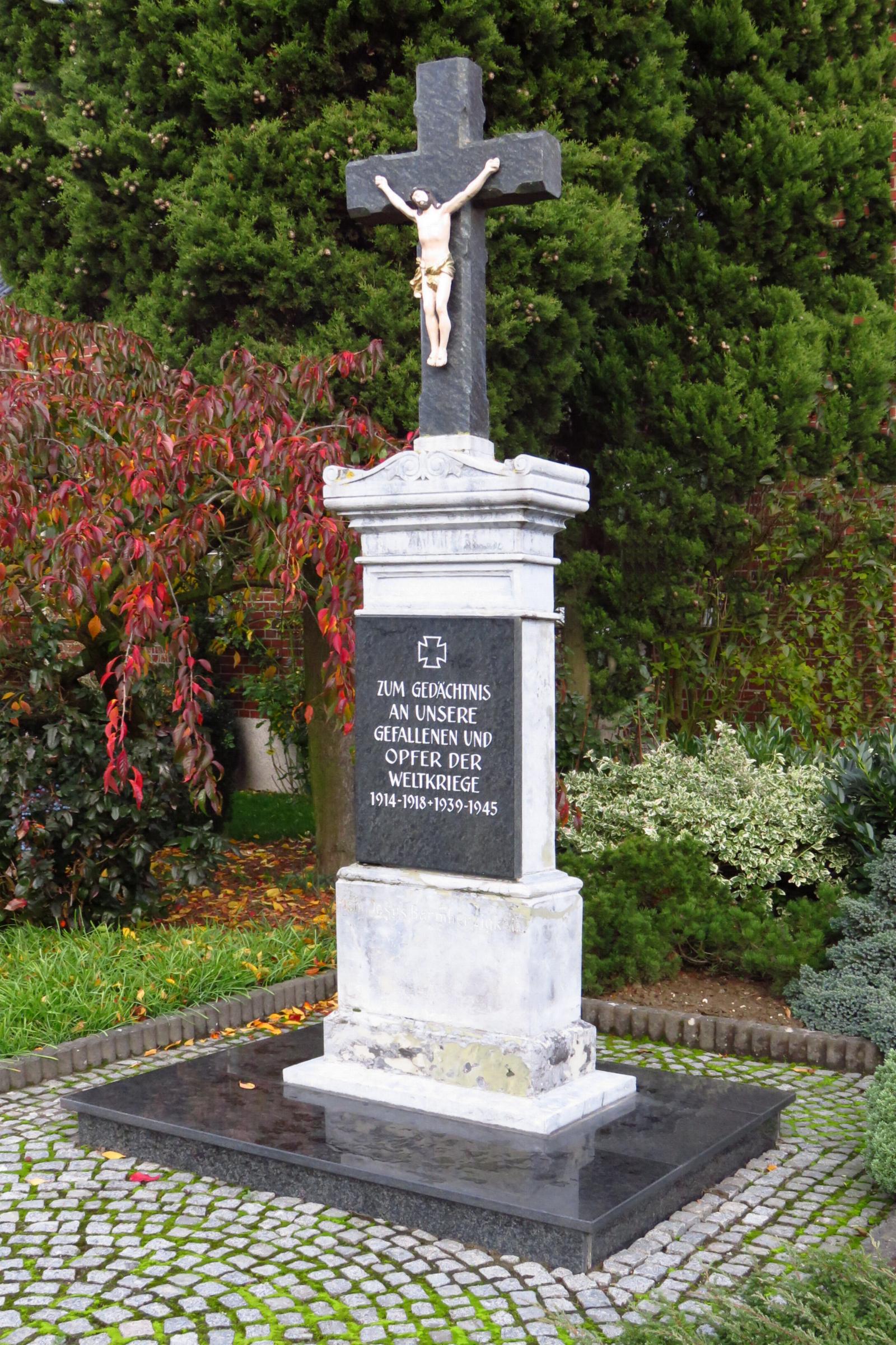 Standort: Das Gedenkkreuz befindet sich in Wolfsittard 52 im Stadtteil Mönchengladbach - Wolfsittard. Geschichte: Im Vorgarten des Hauses Wolfsittard 52 steht auf einem mehrstufigen Sockel ein schwarzes Steinkreuz mit einem hellen Korpus. Auf dem schwarzen Mittelteil des Sockels weist eine Inschrift darauf hin, das dieses Wegekreuz ein Ehrenmal für die Toten der Weltkriege aus diesem Wohnbereich ist. Sie lautet: "Zum Gedächtnis an unsere Gefallenen und Opfer der Weltkriege. 1914 -1918 1939 -1945." Im weißen Teil des Sockels ist eingemeißelt: Mein Jesus Barmherzigkeit." Der gegliederte Sockel ruht auf einer schwarzen Bodenplatte. Text aus Sakrale Kleindenkmäler - Wegekreuze in Mönchengladbach. Nr. 8 von Heinz Habrich - Klaus Hoffmann