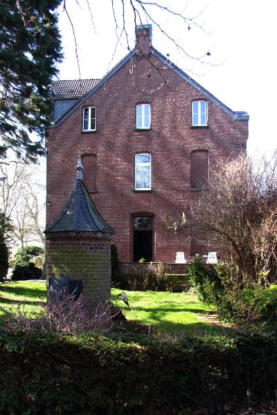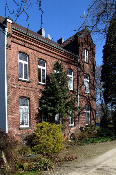 Denkmalbeschreibung: Es handelt sich um eine Ende des 19. Jh. errichtete ehemals wasserumwehrte 4-flüglige Backsteinhofanlage. Das Wohnhaus ist 2-geschossig und in 5 Achsen gegliedert. Die rechte Achse ist verbreitert, leicht vorgezogen und übergiebelt; der Eingang ist seitlich. Das Wohnhaus weist im Innern die ursprüngliche Grundrisskonzeption und das originale Treppenhaus in gutem Erhaltungszustand auf, neben den stuckverzierten Decken (Rosetten und profilierte Umrahmungen) Teile von Holzvertäfelungen der Unterzüge im Flur und Treppenaufgang. Im Garten vor dem Haus befindet sich ein Brunnen aus Backstein, übermauert und mit Helmdach. Auf dem Hofgelände befindet sich eine gusseiserne Pumpe über erhaltenem Brunnenschacht und eine Basaltlavaausgussrinne. Vor dem Hof Wegekreuz aus dem Jahre 1888; Sockel mit Inschrift und Jahreszahl, Muschelnische, Kreuz mit Korpus aus Sandstein.