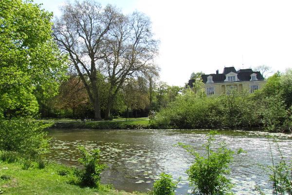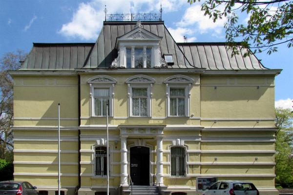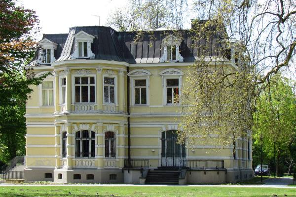 Denkmalbeschreibung: 1888 erbaute 2-geschossige Villa in historisierenden Schmuckformen mit Säulenvorlagen über dem Eingang und an den Seiten, Putzfassade mit Stuckornamentik, an der Gartenseite 5-seitig breit vorgezogener Erker mit Pilastergliederung und Haubendach; Mansarddach. Ehem. zugehörig: Garten mit altem Baumbestand, heute Stadtpark.