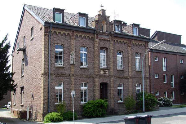 Wohnheim für Behinderte in Grevenbroich - Gustorf Denkmalbeschreibung: 2-geschossig in 5 Achsen, die mittlere Achse leicht vorgezogen mit Treppengiebel, Backstein, mit Lisenengliederung, und mit Rundbogenfries. Nische mit Josefsfigur, 2-geschossiger Anbau an der rechten Seite mit rückwärtig abgetrepptem Trakt (um 1900). |