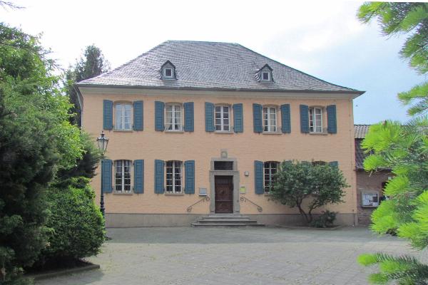 Kath. Pfarrhaus in Grevenbroich - Frimmersdorf Denkmalbeschreibung: 2-geschossiges 5-achsiges Gebäude von 1731. Türgewände und Sohlbänke aus Werkstein, Fassade Backstein geschlämmt. Jahreszahl im Türsturz, Walmdach. |