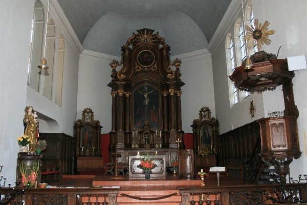 Denkmalbeschreibung: 1754 / 60; Saalkirche mit 3-seitigem Chorschluß aus Backstein, geschlämmt, Chortrakt erhöht und später an das Langhaus angefügt, größtenteils erhaltene Innenausstattung, Rokokostuckdecke.