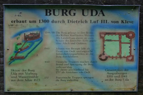 Burgruine in Oedt Denkmalbeschreibung Burgruine der ehem. Burg Uda aus dem 14. Jh. Besondere Merkmale: archäologische Ausgrabung 1959 und 1961, Untergrund und Fundamente freigelegt.