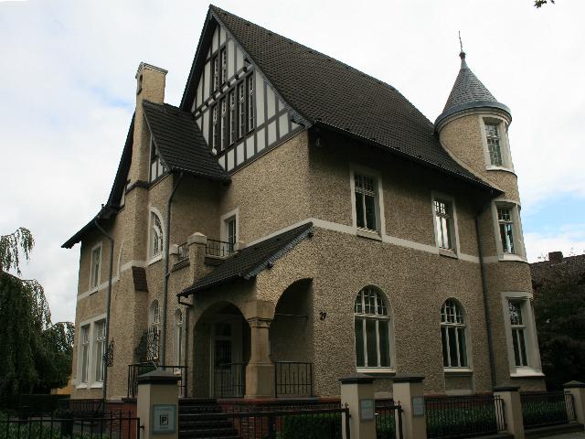 Denkmalbeschreibung: Fabrikantenvilla a. d. Jahre 1901, im Jugendstil u. mit Elementen d. engl. Landhausstils erbaut. 2-geschossig, teilweise ausg. Dachgeschoß m. versetztem Kreuz- u. Giebeldach verputzt, Giebel als Fachwerk. Straßenansicht (West): Halbbogeneingang m. Säule, 1 ½ geschossig m. Pultdach, 2 Achsen, EG Rundbogenfenster u. turmartig gestalteter Vorbau (rund) mit 4 Fensterachsen 3-geschossig m. Kegeldach. Seitenansicht rechts (Süd): 1-geschossiger Vorbau m. Dachterrasse viereckig m. 3 Achsen, Rundbogenfenster, I. OG 3 Achsen im vorgezogenen Baukörper, mittl. Fenster im Rundbogen, versetztes Giebeldach als Holzständerwerk m. 2 Achsen. Rückansicht (Ost):EG links 1919 verändert, urspr. Terry. Oder Wintergarten eingeschossig als Küche ausgebaut. (Flachdach), EG 4 wachsig m. 2 Rundbogenfenstern. I.OG