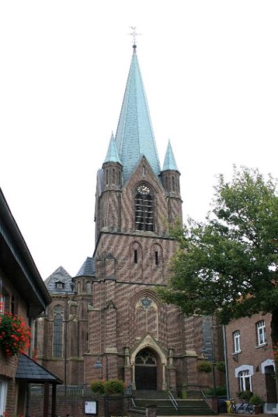 Kath. Pfarrkirche St. Georg in Amern Denkmalbeschreibung: Die neugotische, 3-schiffige Backsteinhallenkirche mit polygonalem Chor, westlichen Querhausarmen und vorgesetztem Westturm wurde in der 2. Hälfte des 15. Jahrhunderts errichtet. Der vorgesetzte Westturm wurde 1900 neugotisch ummantelt. Im Garten der Kirche stehen Grabkreuze des 17. und 18. Jahrhunderts.