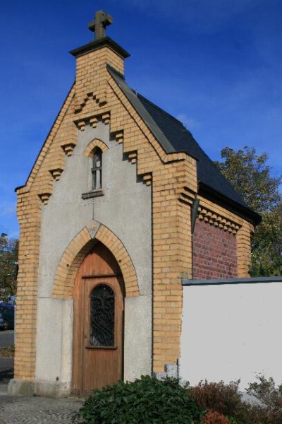 Wegekapelle in Anrath Denkmalbeschreibung: Es handelt sich hierbei um eine Wegekapelle, errichtet Anfang des 20. Jahrhundert (ca. 1910), in Feldbrandziegelmauerwerk und steilem Satteldach mit weicher Eindeckung, im hinteren Bereich als halbseitiges Kegeldach über halbrunder Apsis ausgeführt. Die Fassadenflächen sind in zweifarbigen Ziegelmauerwerk flächig ohne Ornamentik gestaltet. Die Fenster- und Türöffnungen sind mit Spitzbogen versehen. Das schwere, aufgesattelte Gesims wird von 3 stark ausgeprägten pilasterähnlichen Lisenen unterstützt. An der Eingangsseite verlaufen markante Ecklisenen im Bereich der Ortgänge als überschwere unterstaffelte Gesimse weiter und werden im Firstpunkt mit einem quadratischen Säulenpostament zusammengeführt und sind mit einem Crux immissa (lat. Kreuz) gekrönt. Die Wandfläche der einachsigen Eingangsseite ist als Fassadenspiegel verputzt. Erwähnenswert ist, dass die Kapelle seinerzeit in unmittelbarem Zusammenhang mit dem neuen Fabrikgebäude errichtet wurde und demzufolge auch als Werks- und Betriebskapelle definiert werden kann.